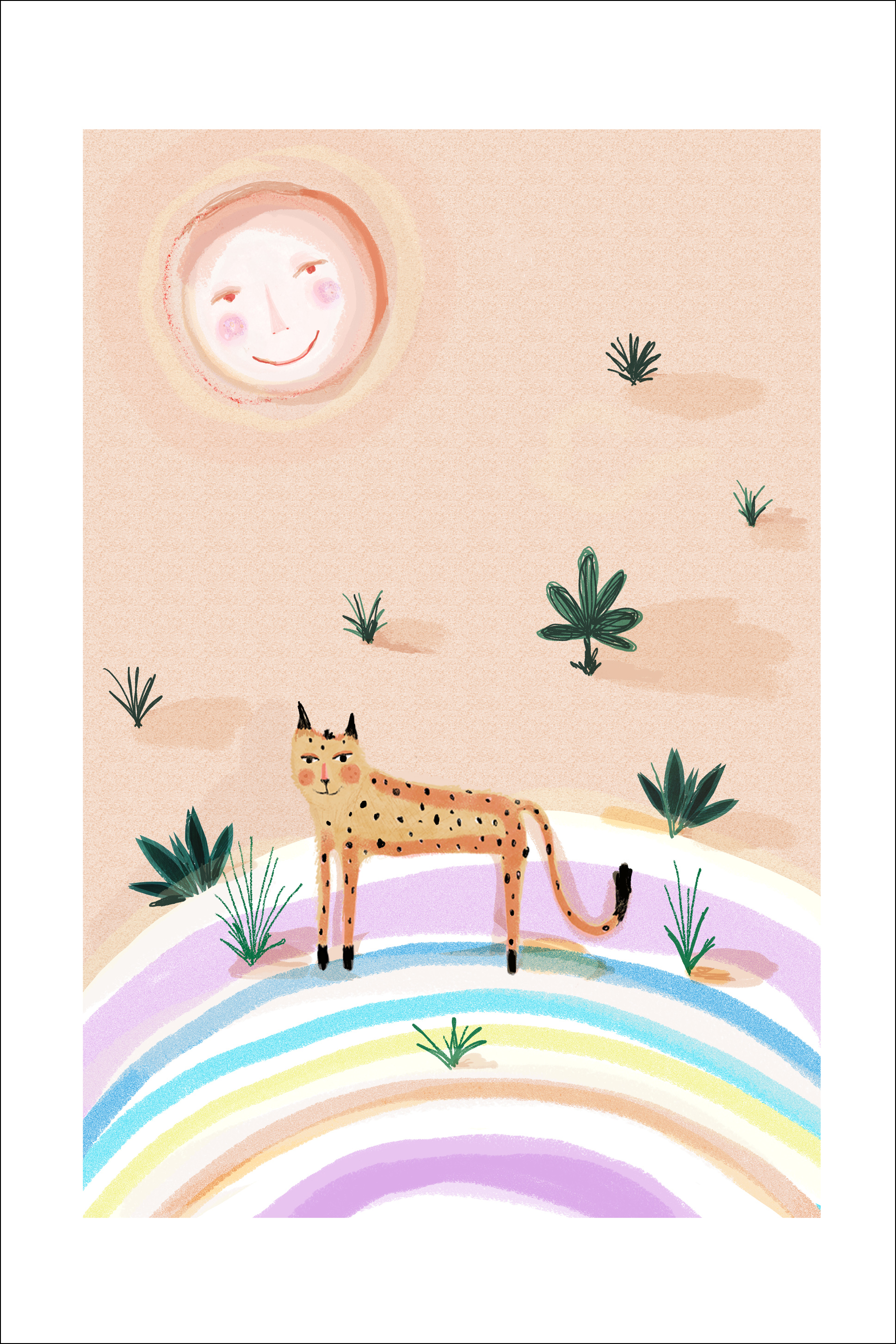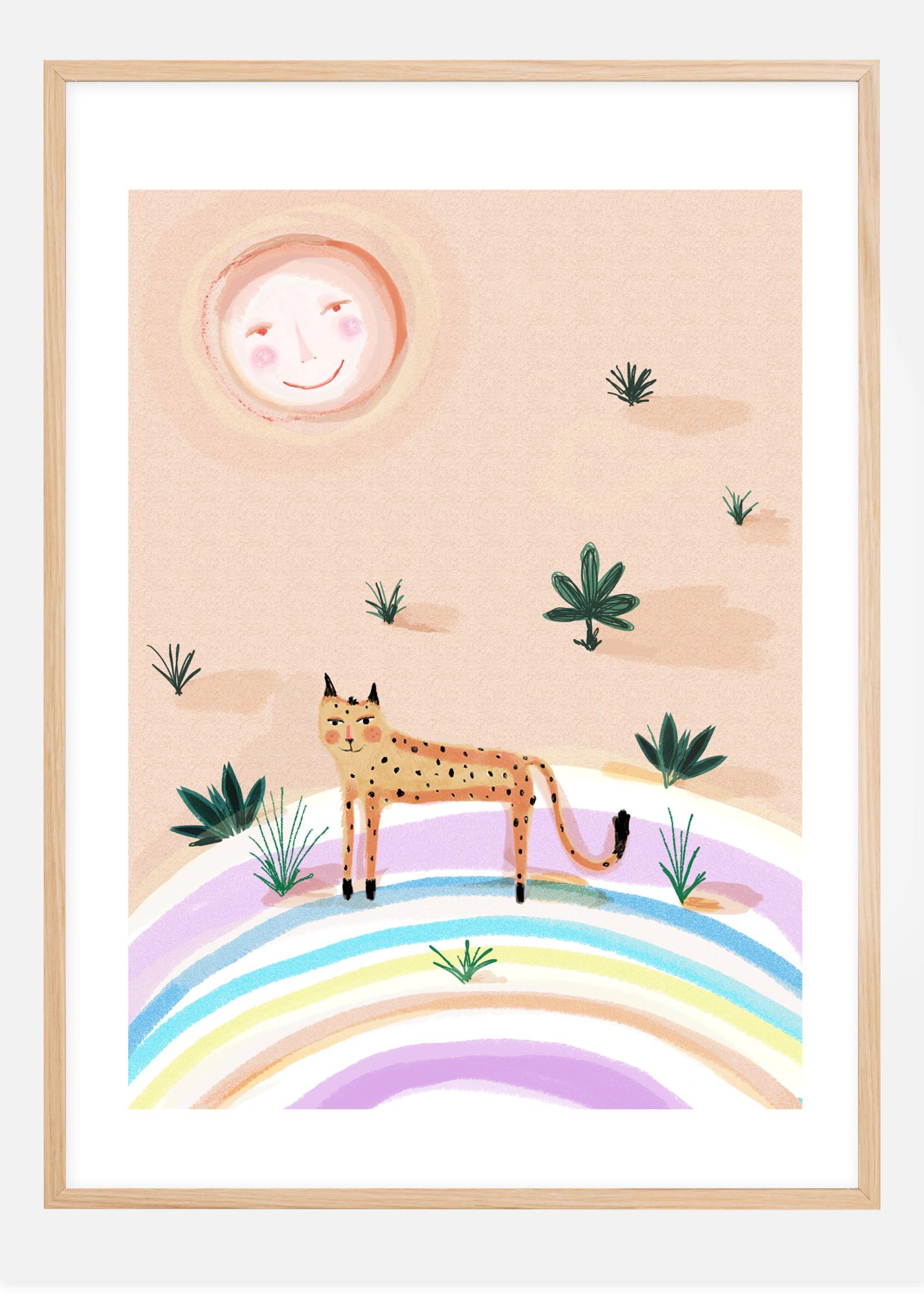 Zabawny plakat pustynny z lampartem i słońcem, które oboje się uśmiechają. Umieszczony na wielobarwnej powierzchni, mały, smukły lampart jest otoczony małymi roślinami pustynnymi. Idealny wydruk do zawieszenia w pokoju dziecka, aby stworzyć radosną atmosferę.