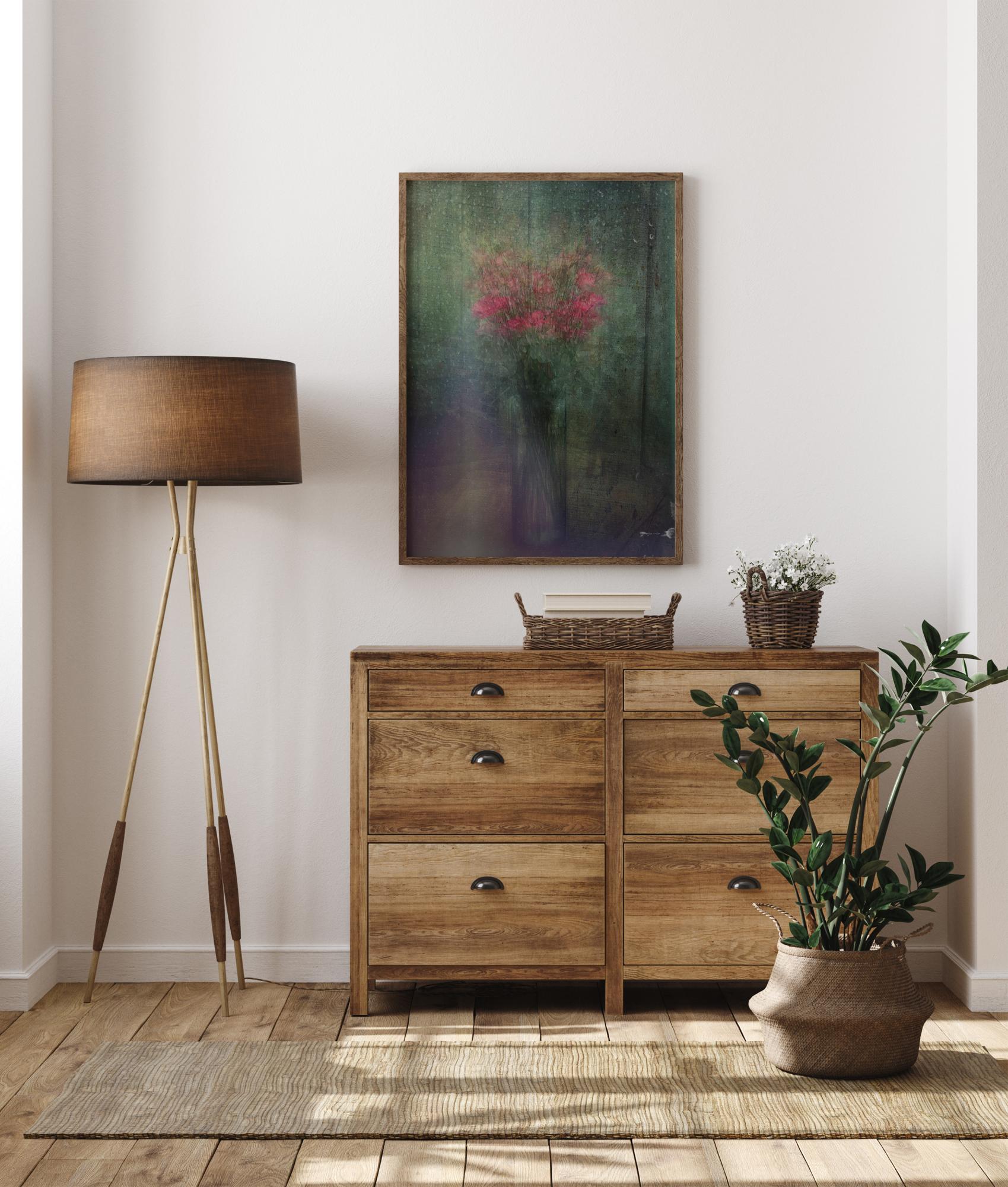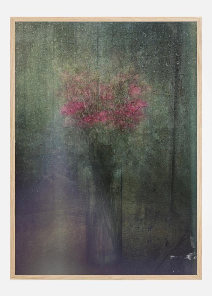 Fantastyczny plakat z różowym bukietem kwiatów w deszczowy dzień. Na zielonym tle stoi przezroczysty wazon na kwiaty na jasnofioletowej powierzchni. Naturalne światło pada na łodygi kwiatów. Idealny wydruk na ścianę w salonie.