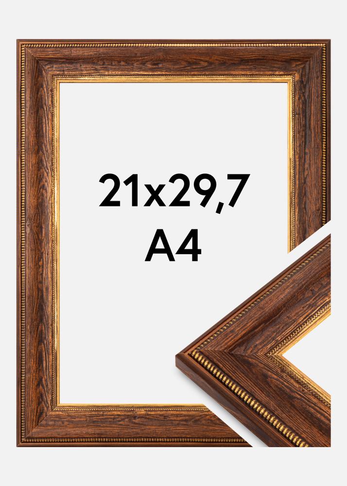 Ta elegancka ramka na zdjęcia o wymiarach 21x29,7 cm to doskonałe połączenie rustykalnego uroku i klasycznej elegancji. Wykonana z wysokiej jakości drewna, ramka ma głęboki brązowy kolor z dekoracyjnymi złotymi detalami wzdłuż wewnętrznej krawędzi. Struktura drewna jest wyraźnie widoczna i nadaje ciepłe i naturalne odczucie, podczas gdy złote elementy dodają wyrafinowanego akcentu, który doskonale pasuje do tradycyjnych i inspirowanych vintage aranżacji wnętrz.