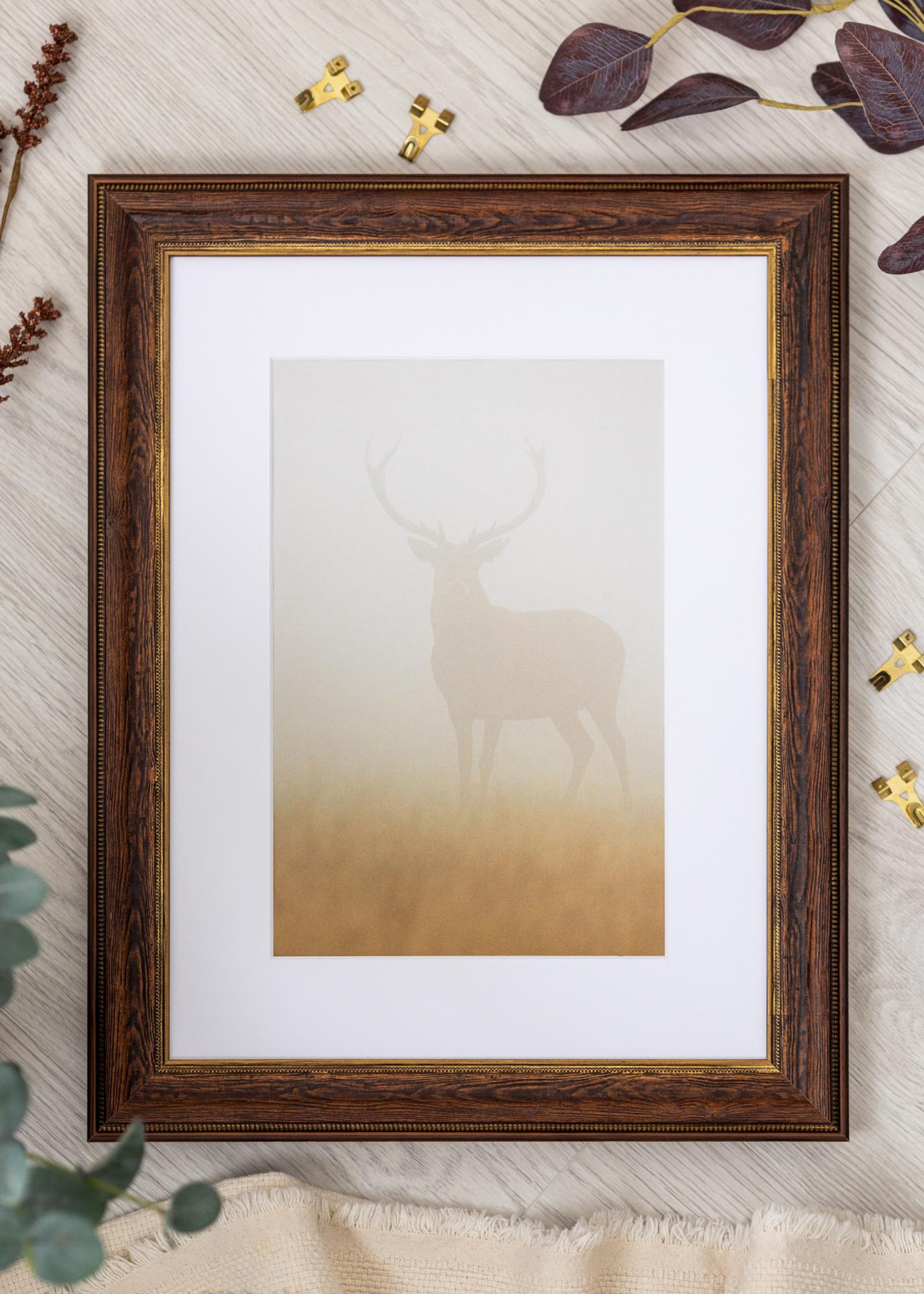 Ta elegancka ramka do zdjęć w rozmiarze 59,4x84,1 cm to doskonałe połączenie rustykalnego uroku i klasycznej elegancji. Wykonana we Włoszech z wysokiej jakości drewna, ramka ta ma głęboki brązowy kolor z dekoracyjnymi złotymi detalami wzdłuż wewnętrznej krawędzi. Struktura drewna jest wyraźnie widoczna, co nadaje ciepły i naturalny wygląd, a złote akcenty dodają wyrafinowanego charakteru, idealnie pasując do tradycyjnych i inspirowanych stylem vintage wnętrz.