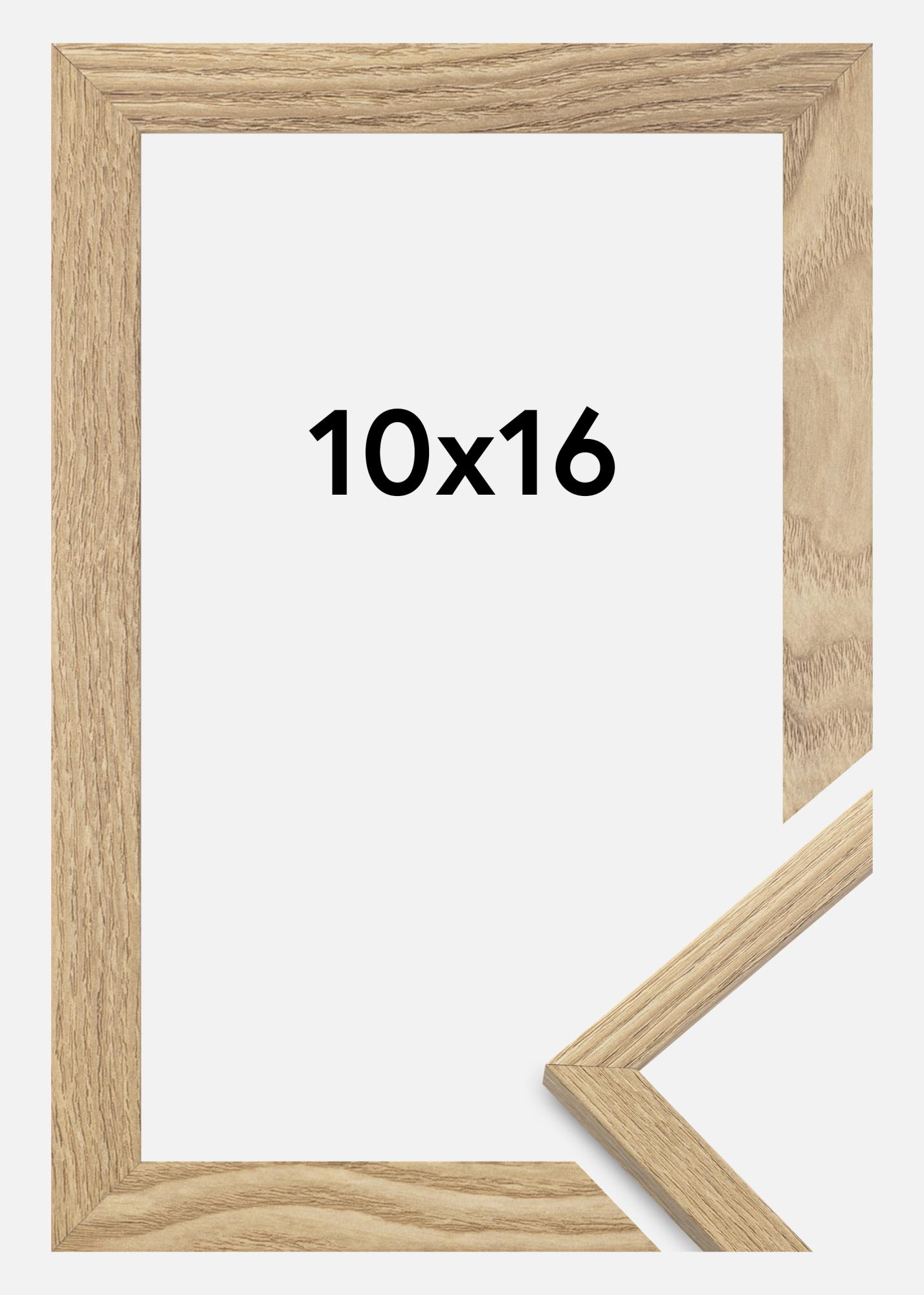 Rama jest wykonana z materiału MDF z foliowaną powierzchnią w kolorze dębu i ma cienki profil ramy o szerokości 14 mm. Jest dużo miejsca, aby uzupełnić zdjęcia luksusowym passe-partout, dzięki wewnętrznej głębokości ramy (głębokość felc) wynoszącej 12 mm.