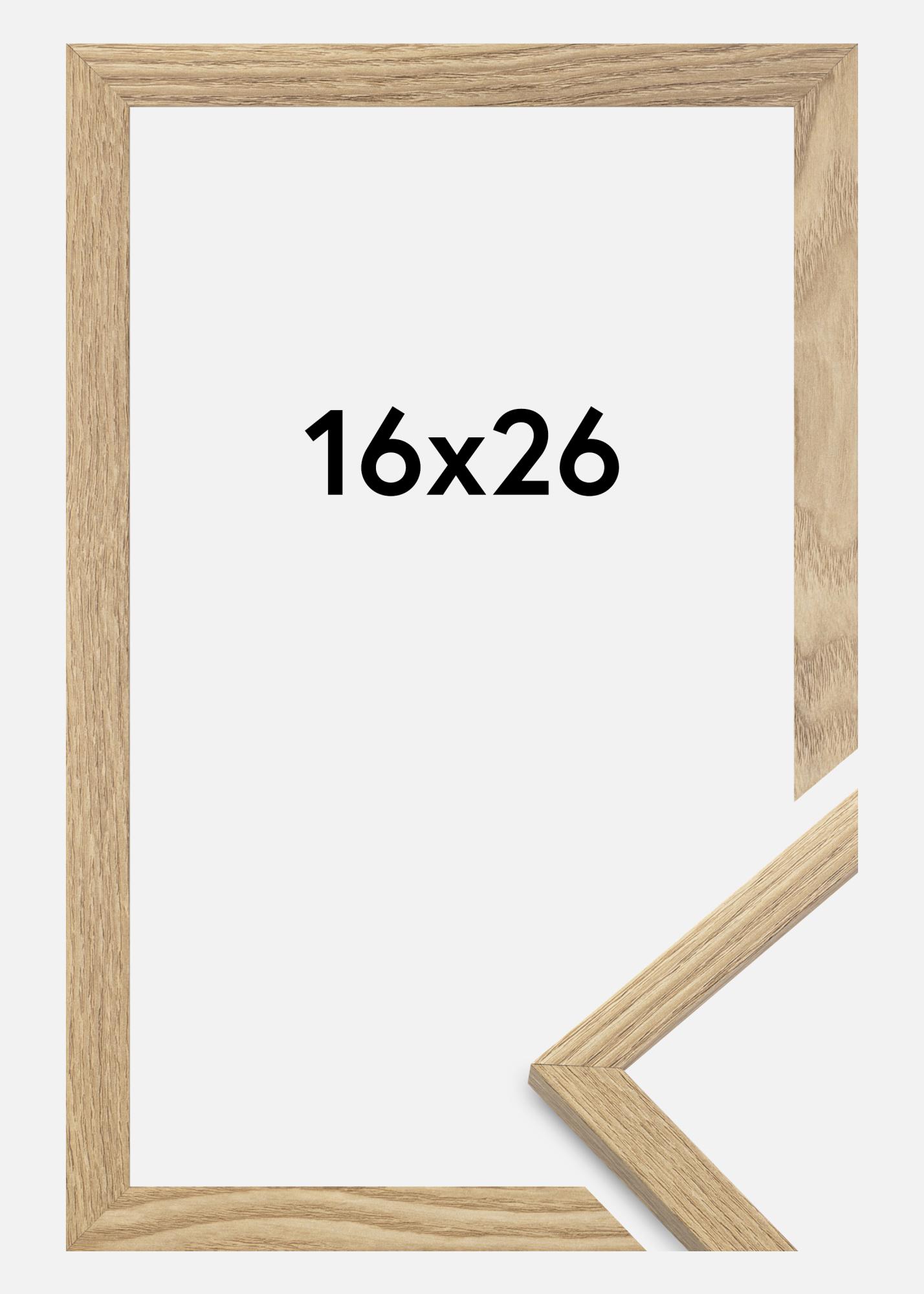 Rama jest wykonana z materiału MDF z foliowaną powierzchnią w kolorze dębu i ma cienki profil ramy o szerokości 14 mm. Jest dużo miejsca, aby uzupełnić zdjęcia luksusowym passe-partout, dzięki wewnętrznej głębokości ramy (głębokość felc) wynoszącej 12 mm.