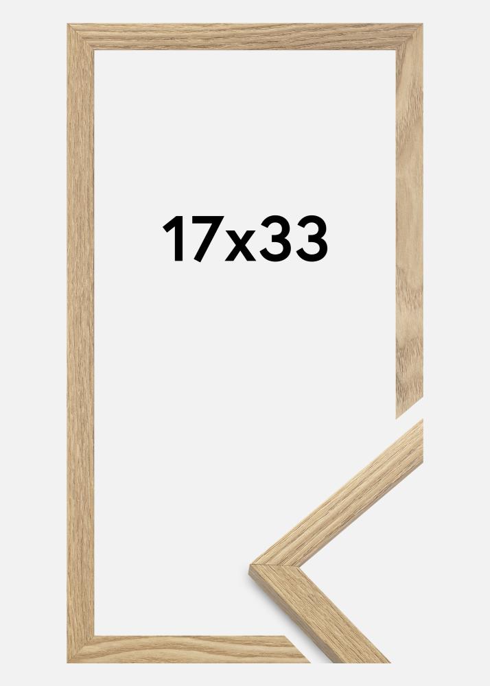 Rama jest wykonana z materiału MDF z foliowaną powierzchnią w kolorze dębu i ma cienki profil ramy o szerokości 14 mm. Jest dużo miejsca, aby uzupełnić zdjęcia luksusowym passe-partout, dzięki wewnętrznej głębokości ramy (głębokość felc) wynoszącej 12 mm.