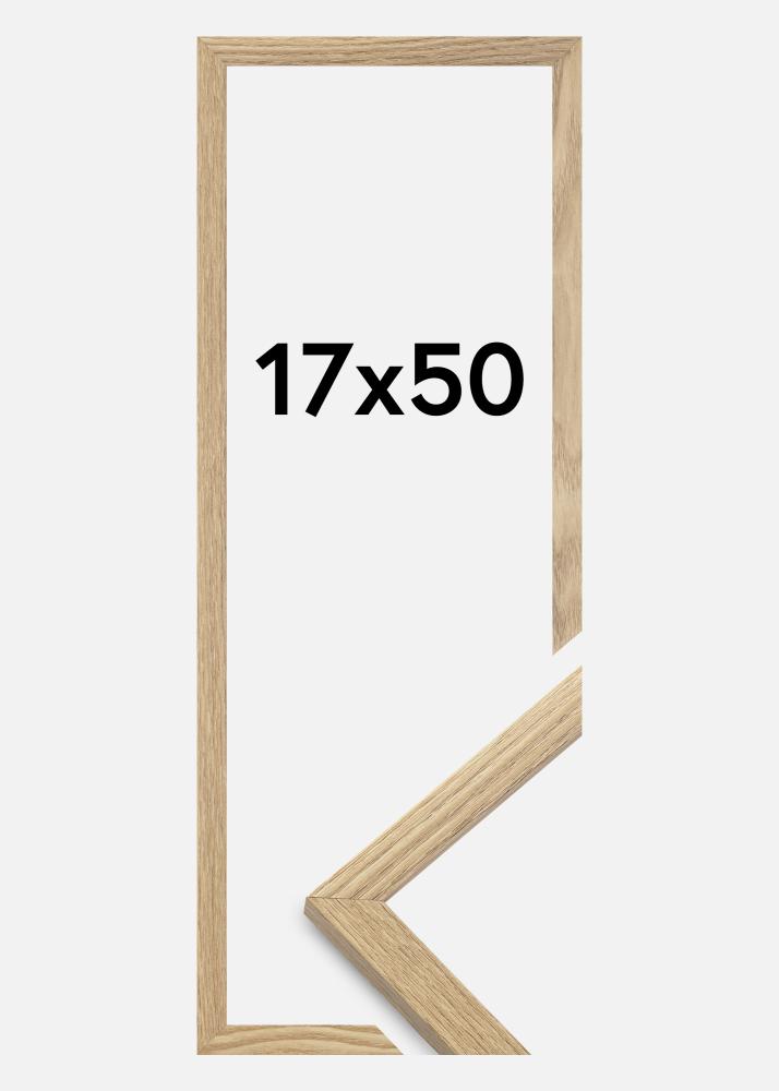 Rama jest wykonana z materiału MDF z foliowaną powierzchnią w kolorze dębu i ma cienki profil ramy o szerokości 14 mm. Jest dużo miejsca, aby uzupełnić zdjęcia luksusowym passe-partout, dzięki wewnętrznej głębokości ramy (głębokość felc) wynoszącej 12 mm.