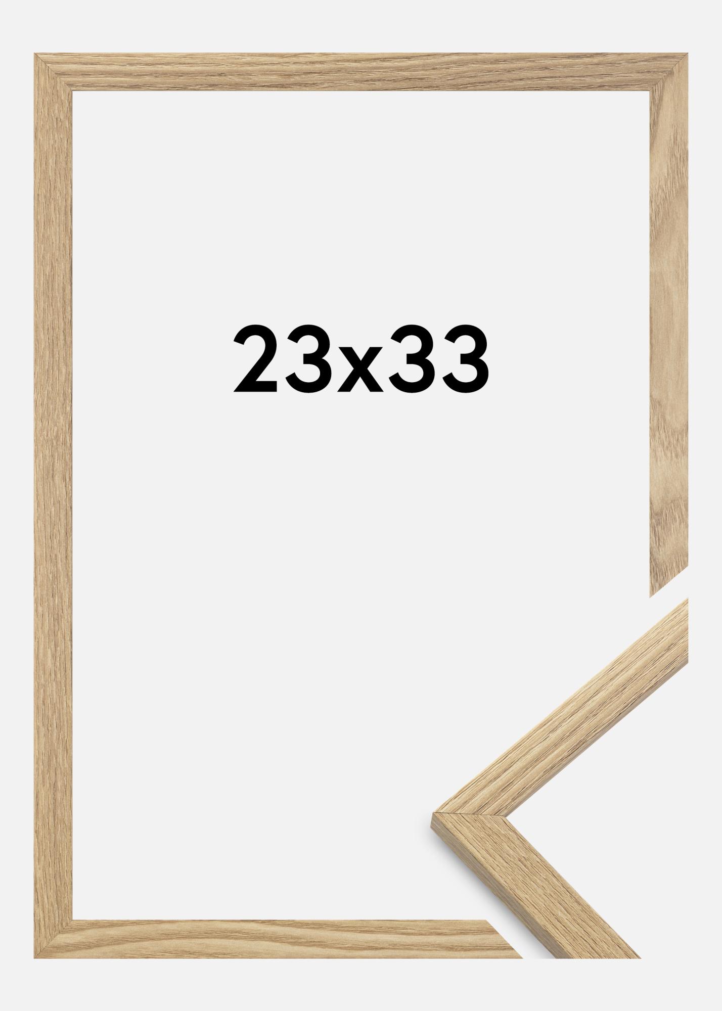 Rama jest wykonana z materiału MDF z foliowaną powierzchnią w kolorze dębu i ma cienki profil ramy o szerokości 14 mm. Jest dużo miejsca, aby uzupełnić zdjęcia luksusowym passe-partout, dzięki wewnętrznej głębokości ramy (głębokość felc) wynoszącej 12 mm.