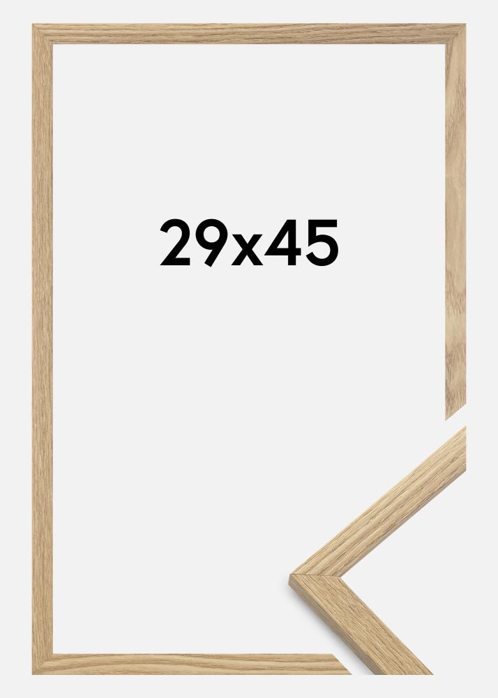 Rama jest wykonana z materiału MDF z foliowaną powierzchnią w kolorze dębu i ma cienki profil ramy o szerokości 14 mm. Jest dużo miejsca, aby uzupełnić zdjęcia luksusowym passe-partout, dzięki wewnętrznej głębokości ramy (głębokość felc) wynoszącej 12 mm.