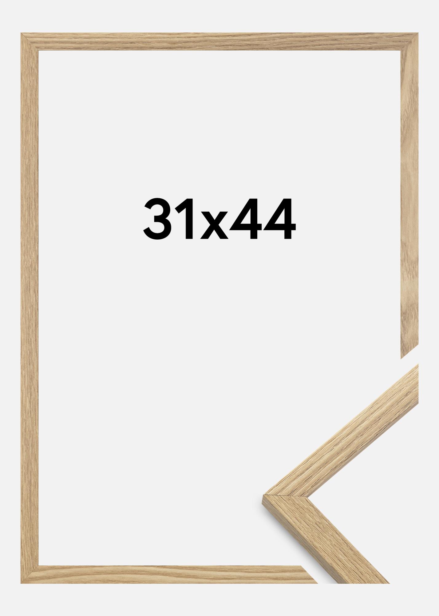 Rama jest wykonana z materiału MDF z foliowaną powierzchnią w kolorze dębu i ma cienki profil ramy o szerokości 14 mm. Jest dużo miejsca, aby uzupełnić zdjęcia luksusowym passe-partout, dzięki wewnętrznej głębokości ramy (głębokość felc) wynoszącej 12 mm.