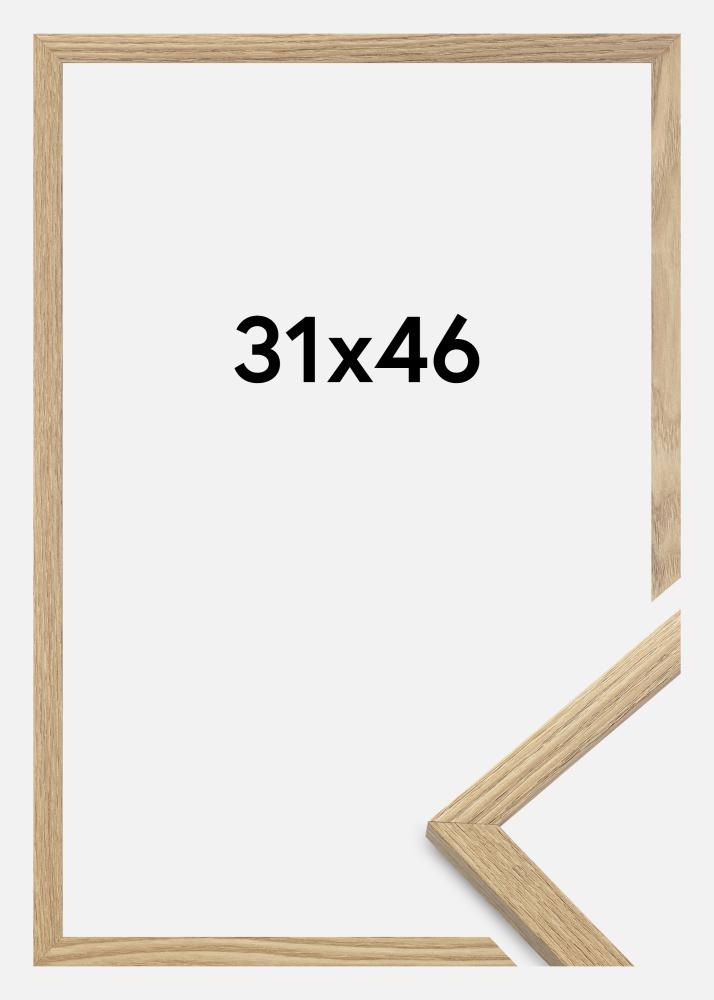 Rama jest wykonana z materiału MDF z foliowaną powierzchnią w kolorze dębu i ma cienki profil ramy o szerokości 14 mm. Jest dużo miejsca, aby uzupełnić zdjęcia luksusowym passe-partout, dzięki wewnętrznej głębokości ramy (głębokość felc) wynoszącej 12 mm.