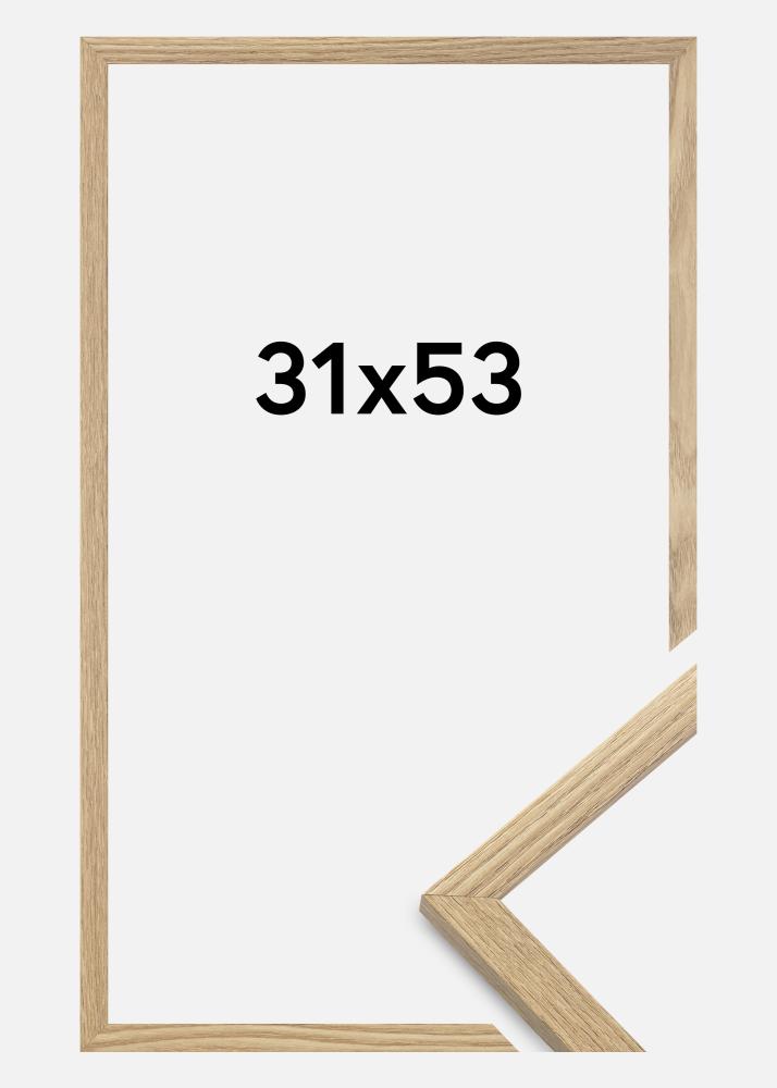 Rama jest wykonana z materiału MDF z foliowaną powierzchnią w kolorze dębu i ma cienki profil ramy o szerokości 14 mm. Jest dużo miejsca, aby uzupełnić zdjęcia luksusowym passe-partout, dzięki wewnętrznej głębokości ramy (głębokość felc) wynoszącej 12 mm.