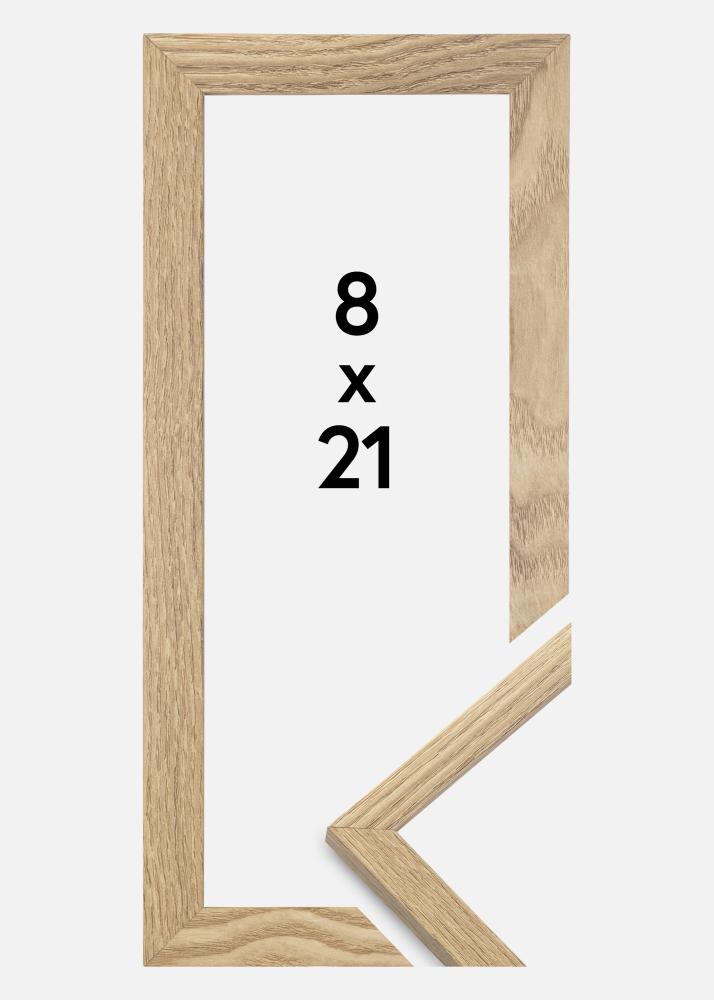 Rama jest wykonana z materiału MDF z foliowaną powierzchnią w kolorze dębu i ma cienki profil ramy o szerokości 14 mm. Jest dużo miejsca, aby uzupełnić zdjęcia luksusowym passe-partout, dzięki wewnętrznej głębokości ramy (głębokość felc) wynoszącej 12 mm.