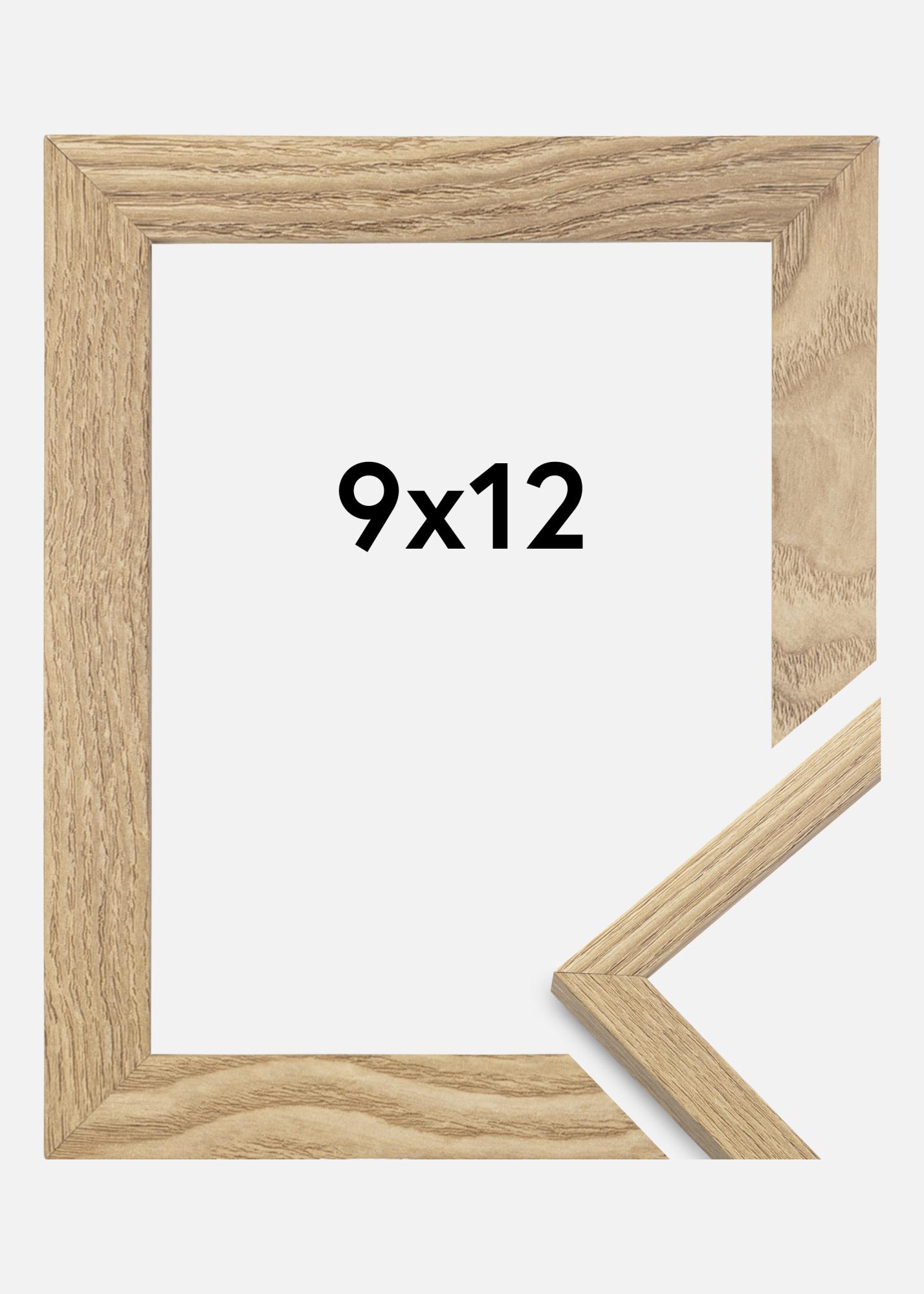 Rama jest wykonana z materiału MDF z foliowaną powierzchnią w kolorze dębu i ma cienki profil ramy o szerokości 14 mm. Jest dużo miejsca, aby uzupełnić zdjęcia luksusowym passe-partout, dzięki wewnętrznej głębokości ramy (głębokość felc) wynoszącej 12 mm.