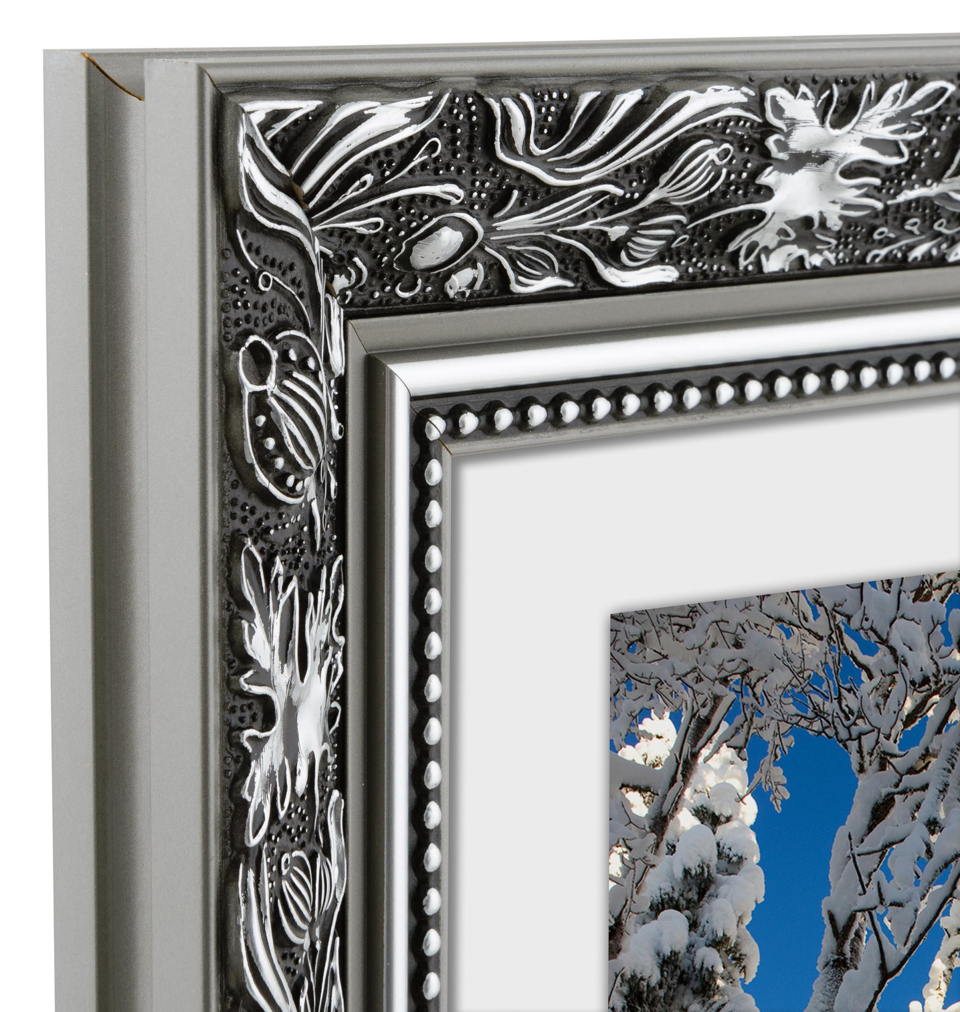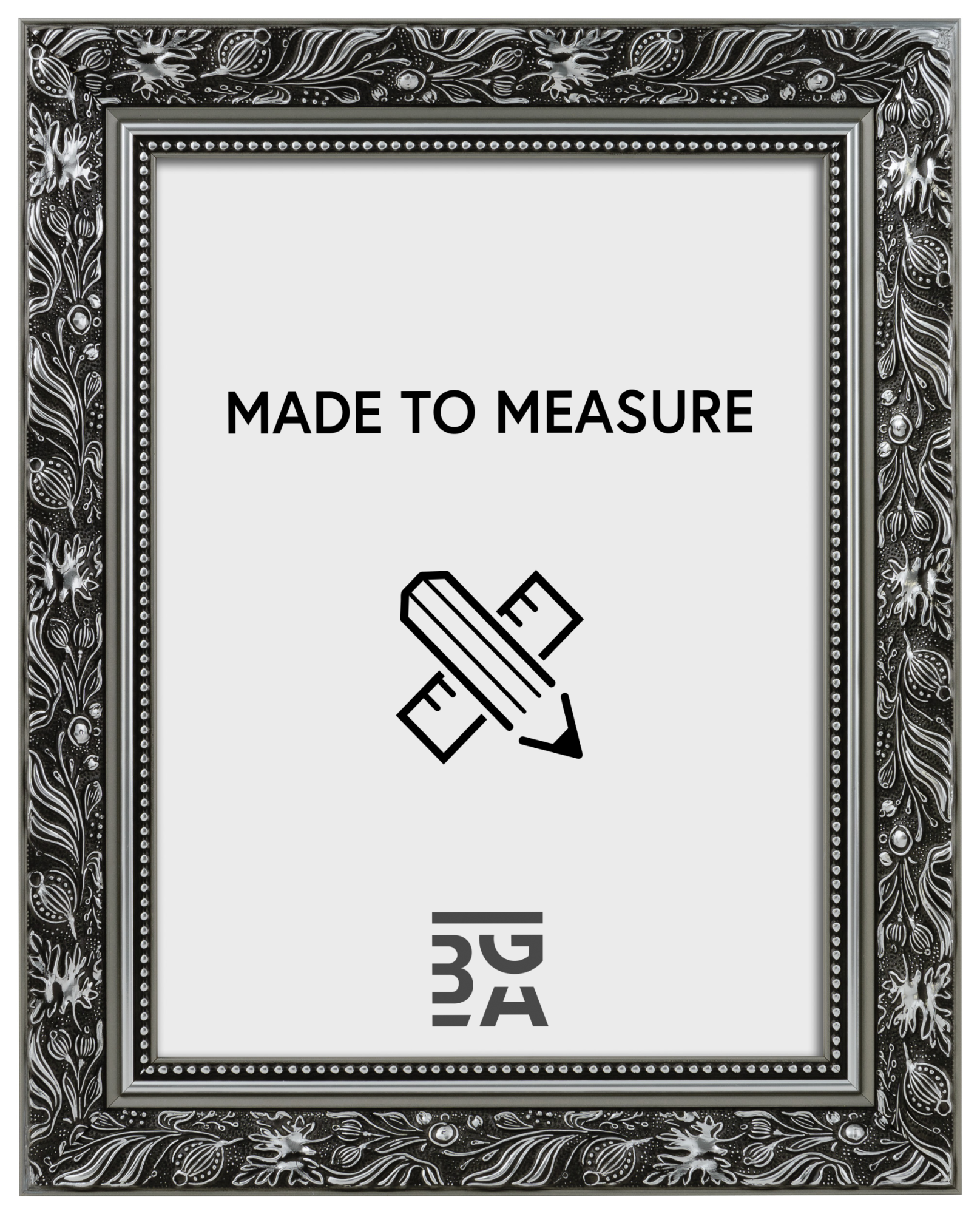 Uczyń ścianę luksusową, jednocześnie przyciągając dodatkową uwagę do swojego obrazu! Ta piękna rama ma podwójny profil, który wygląda bardzo elegancko na ścianie. Krawędzie są całkowicie srebrne, podczas gdy front jest czarny i ma srebrny wzór z liśćmi i zakrzywionymi kształtami. Najbliżej szkła biegnie srebrna krawędź, a czarny fragment ma perłowy wzór w srebrze. Ponieważ rama jest wykonywana zgodnie z twoimi wymiarami, możesz być pewien, że będzie pasować dokładnie tam, gdzie chcesz.