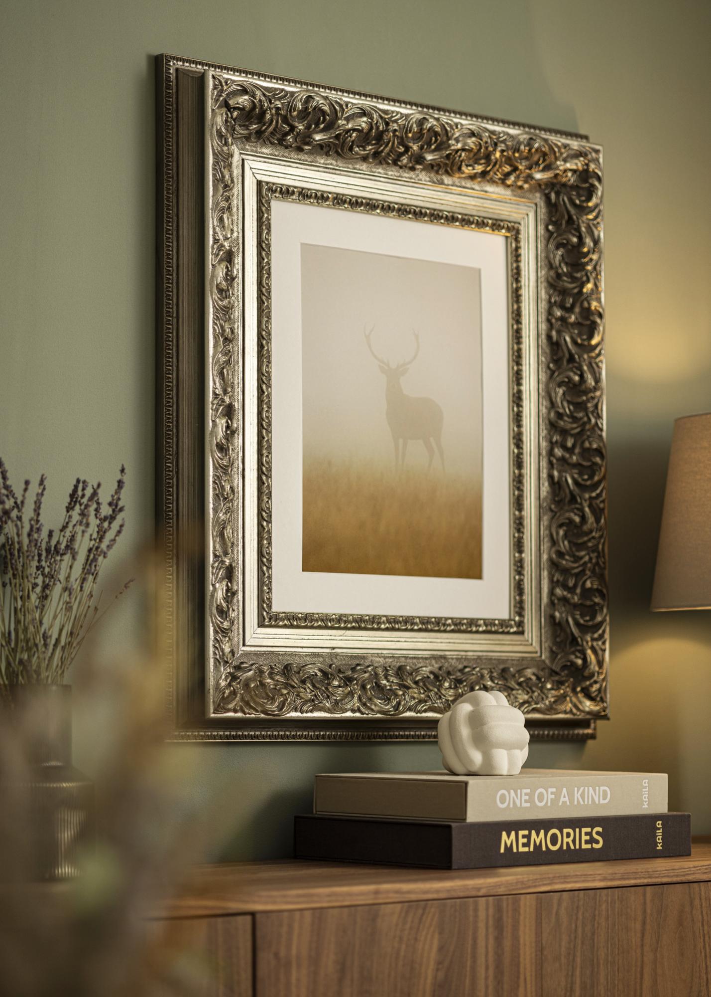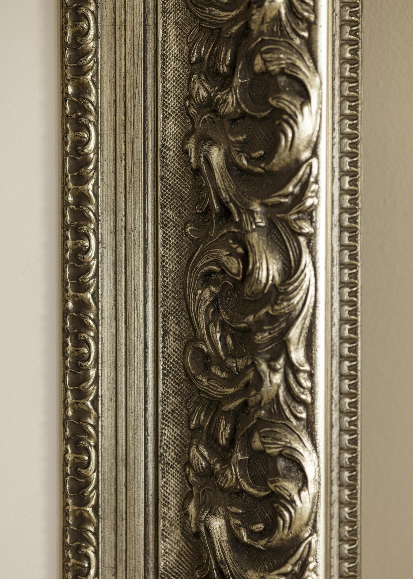 Ta bogato zdobiona rama w antycznym srebrze posiada skomplikowane detale i piękną patynę, która nadaje poczucie elegancji i ponadczasowości. Głęboka płaskorzeźba podkreśla rzeźbione wzory liści, co czyni ją idealnym wyborem dla klasycznych motywów i opraw, które wymagają wyraźnej i dekoracyjnej ramki na obrazy.