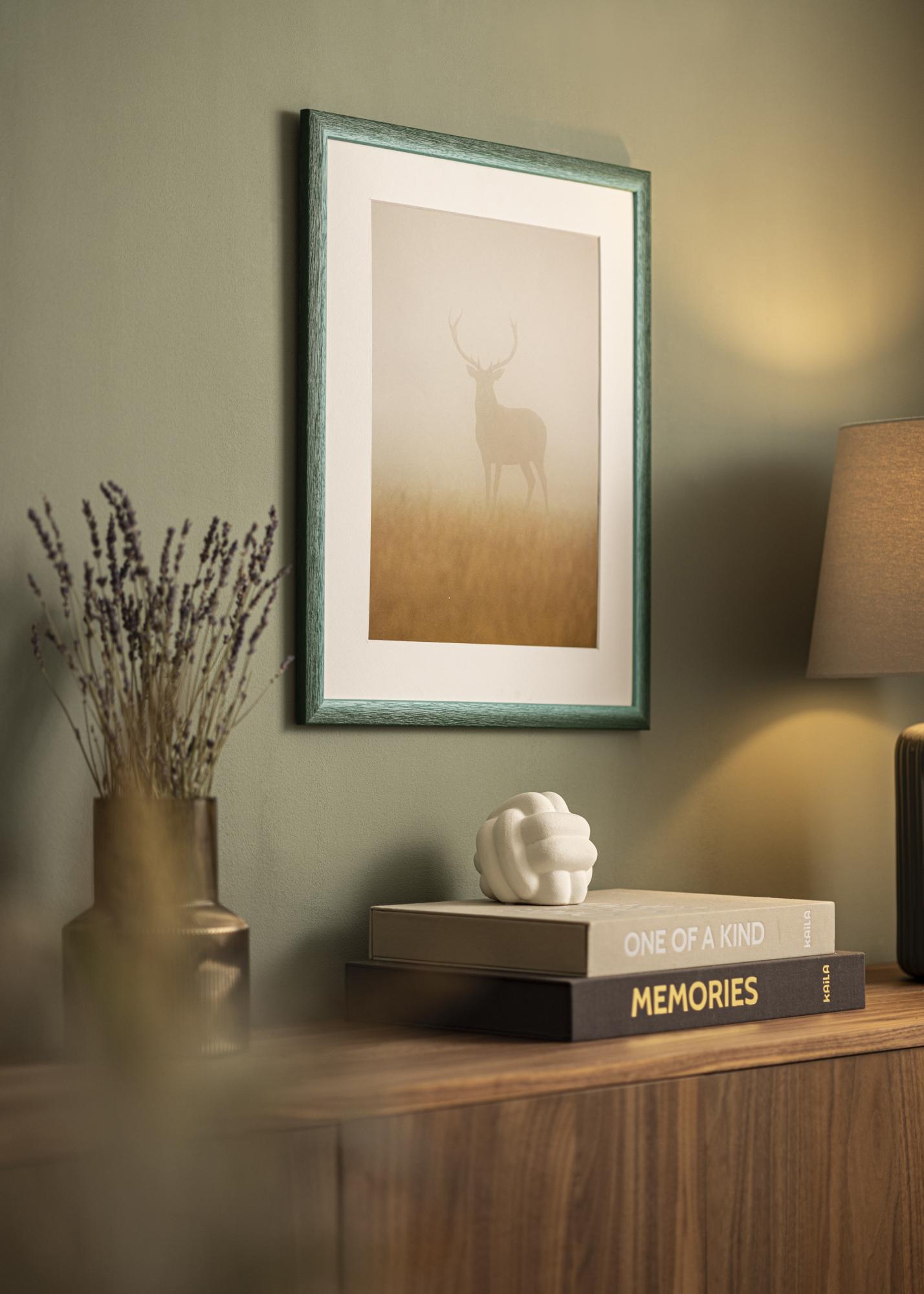 Stonowany zielony kolor ma subtelne wariacje, które nadają żywy i naturalny wygląd, podczas gdy wyrazista struktura drewna z głębokimi słojami tworzy rustykalne wrażenie. Powierzchnia ma matowe wykończenie, które łagodzi intensywność koloru i nadaje delikatne wrażenie, co sprawia, że Twoje zdjęcia naprawdę mogą być w centrum uwagi. Wąski profil równoważy rustykalny wygląd z nowoczesną prostotą.