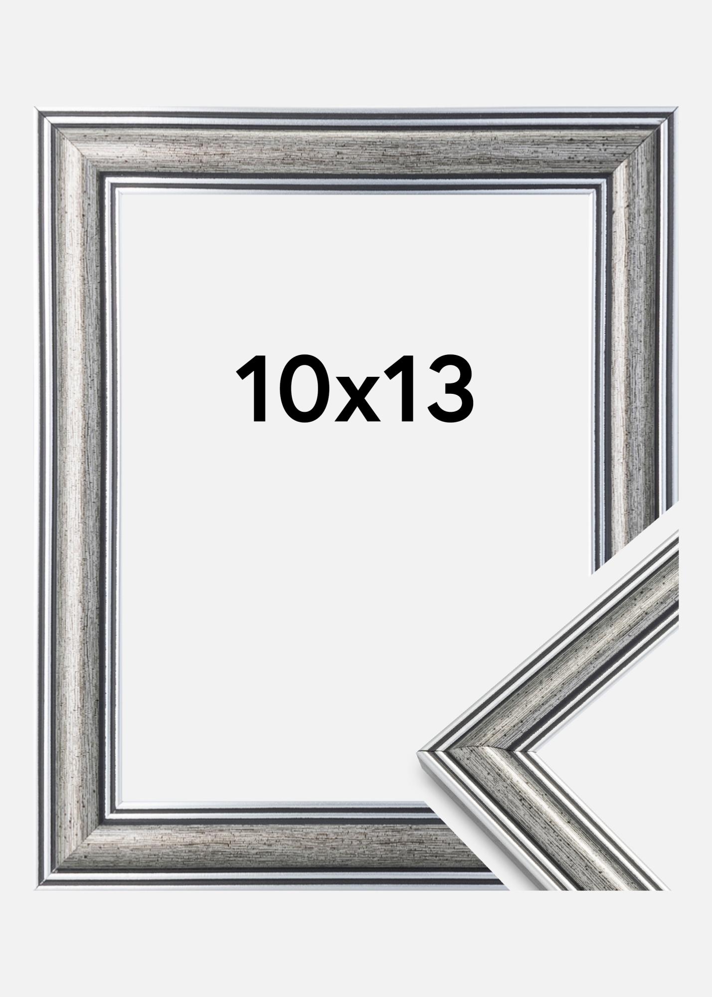 Frigg jest srebrną ramką z czarnymi liniami i czarno-nakrapianymi akcentami. Doskonała, gdy szukasz szerokiej tradycyjnej srebrnej ramki, która pasuje do wielu rodzajów zdjęć i środowisk.