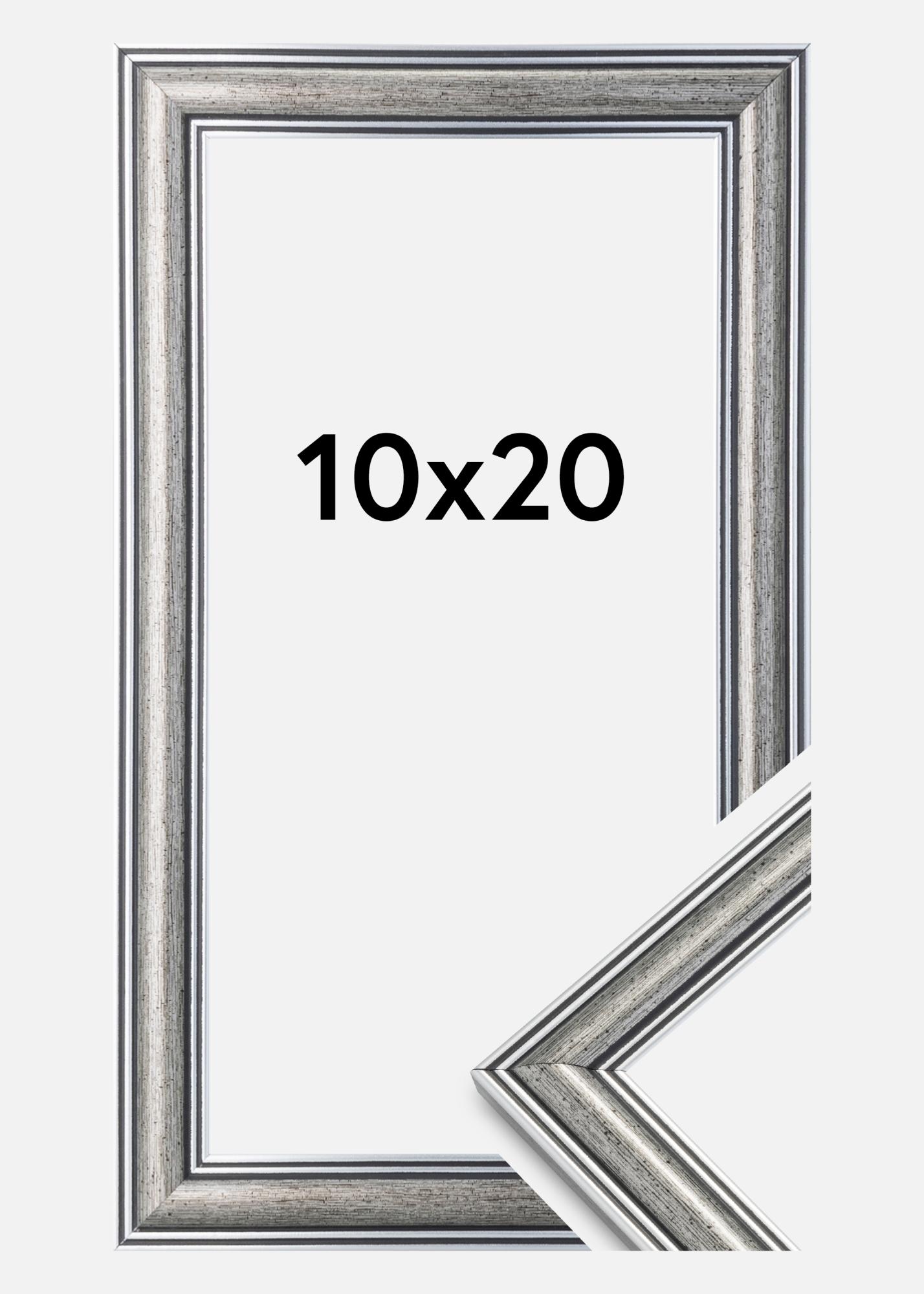 Frigg to srebrna ramka z czarnymi liniami i czarnymi plamkami. Idealna, gdy szukasz szerokiej, tradycyjnej srebrnej ramki, która pasuje do wielu rodzajów obrazów i środowisk.