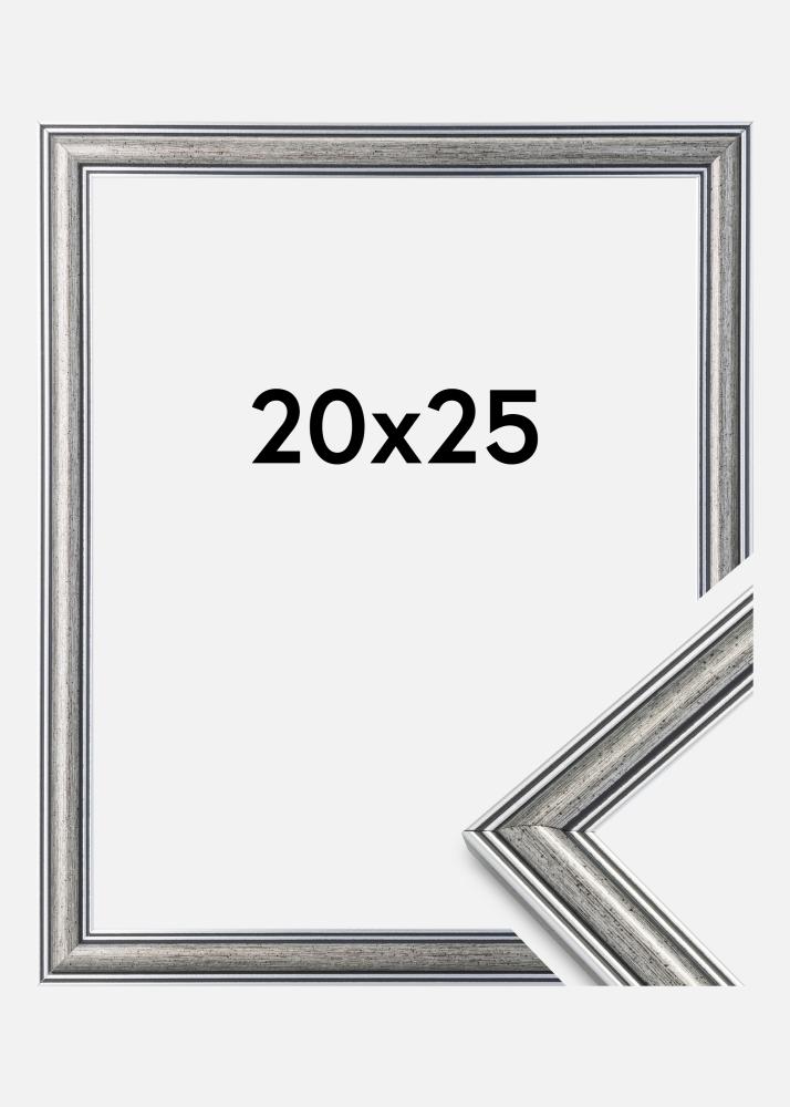 Frigg to srebrna ramka z czarnymi liniami i czarnymi plamkami. Świetnie nadaje się, gdy szukasz szerokiej tradycyjnej srebrnej ramki, która pasuje do wielu rodzajów obrazów i środowisk.