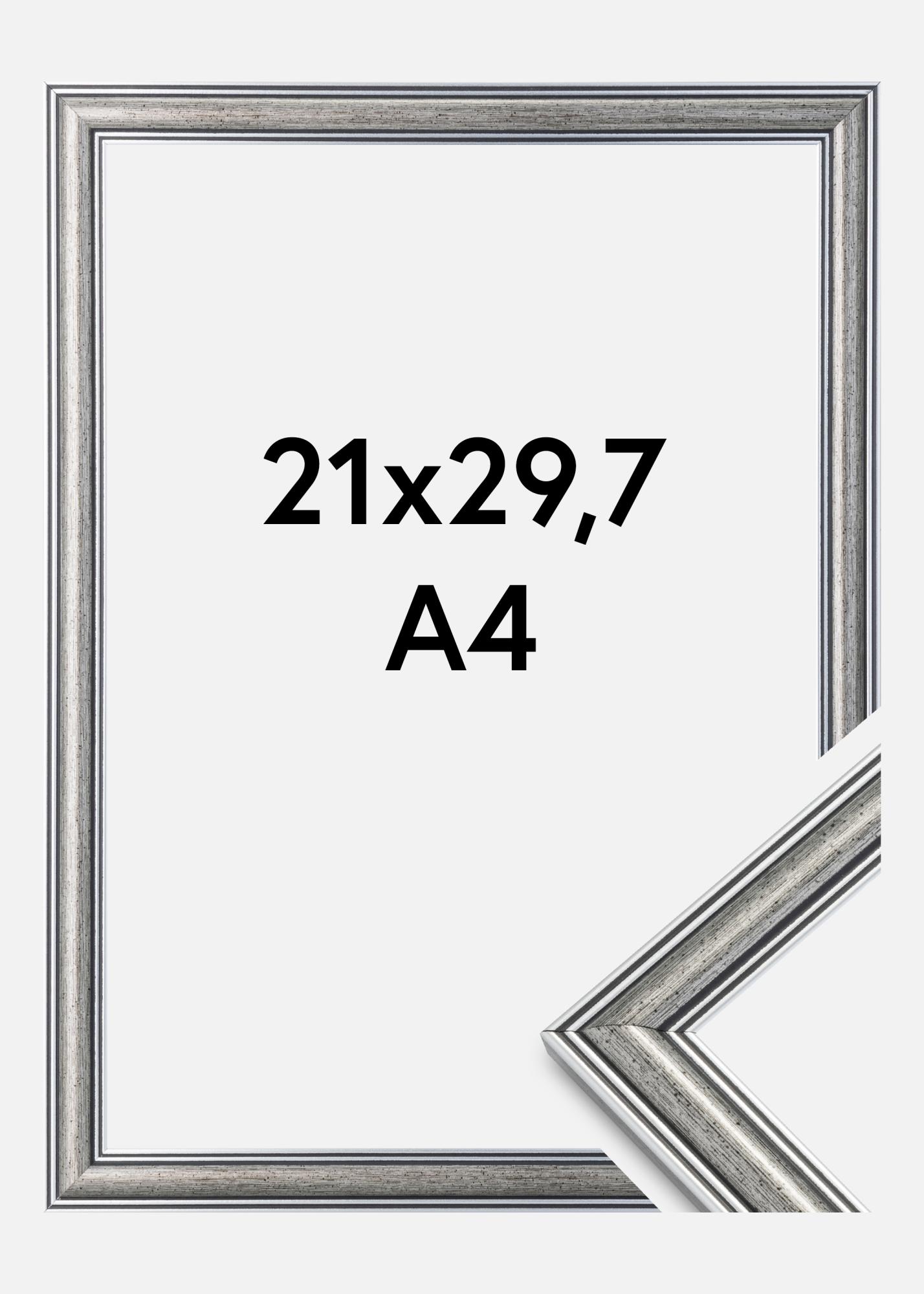 Frigg to srebrna ramka z czarnymi liniami i czarno-pstre elementy. Idealnie nadaje się, gdy szukasz szerokiej tradycyjnej srebrnej ramki pasującej do wielu typów obrazów i środowisk.
