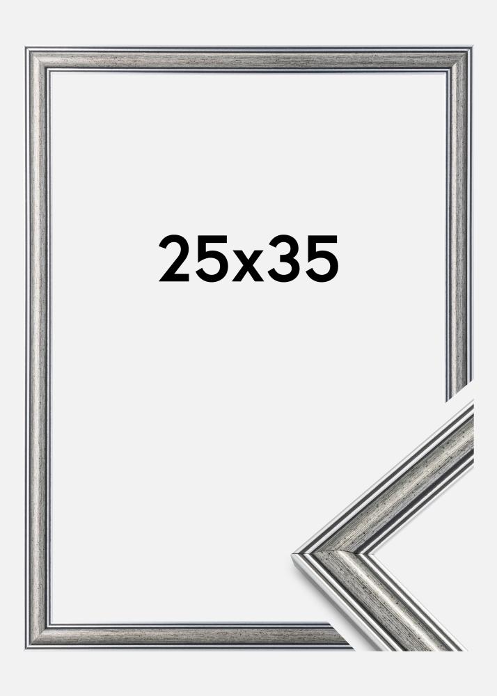 Uruchom wyszukiwarkę ramek »Frigg to srebrna ramka z czarnymi liniami i czarnymi plamami. Idealna, gdy szukasz szerokiej tradycyjnej srebrnej ramki pasującej do wielu rodzajów zdjęć i wnętrz.