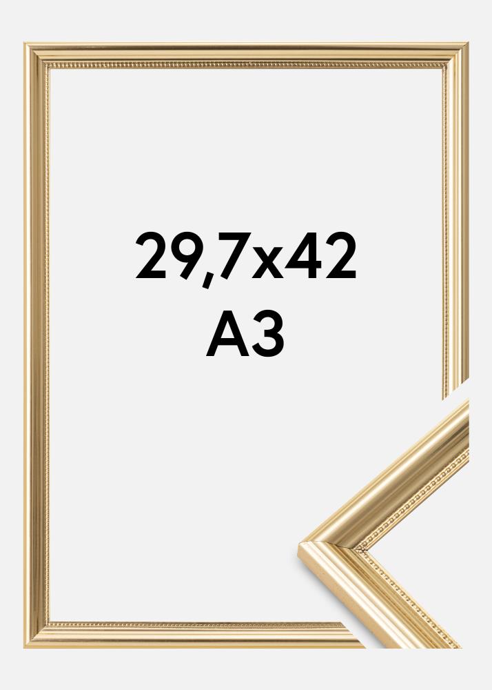 Dodaj swoim ścianom odrobinę elegancji dzięki tej ramce na zdjęcia w złotym kolorze o wymiarach 29,7x42 cm (A3). Dzięki swojemu profilowanemu retrostajlowemu projektowi, wprowadza klasyczny urok do Twojego domu. Szerokość listwy ramy wynosząca 20 mm i głębokość 17 mm nadają wyraźny i wyrafinowany akcent Twoim ulubionym zdjęciom lub dziełom sztuki.