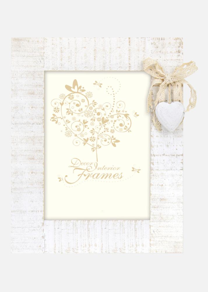 Dodaj swoim wspomnieniom uroku dzięki tej pięknej ramce vintage. Jej wymiary 10x15 cm są idealne do wyeksponowania ulubionych zdjęć z nutką nostalgii. Jasna powierzchnia jest uzupełniona dekoracyjną wstążeczką i sercem, które dodają romantycznego akcentu do Twojego wnętrza.