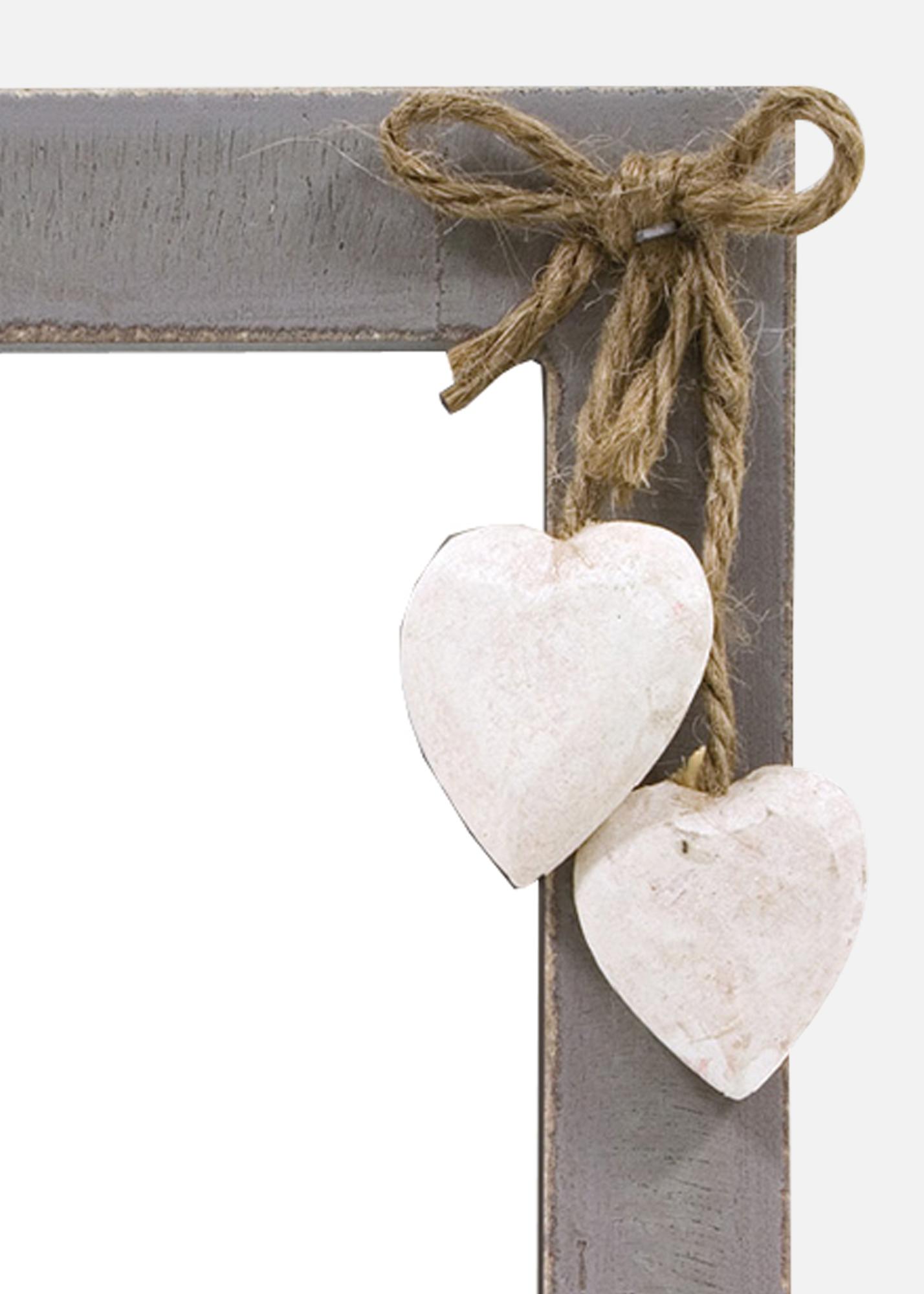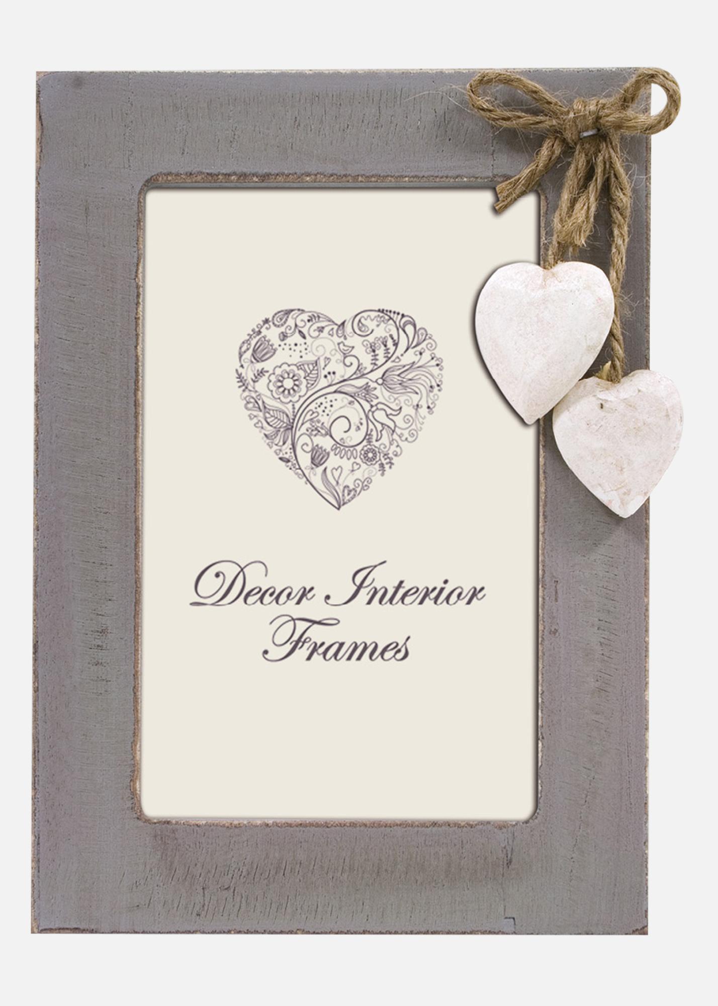 Urokliwa ramka na zdjęcia z rustykalnym wykończeniem w szarym odcieniu. Ozdobiona dwoma sercowymi wisiorkami z drewna i naturalnym sznurkiem dla romantycznego, wiejskiego akcentu. Idealna do podkreślenia twoich najbardziej ukochanych wspomnień i stworzenia ciepłej atmosfery w domu.