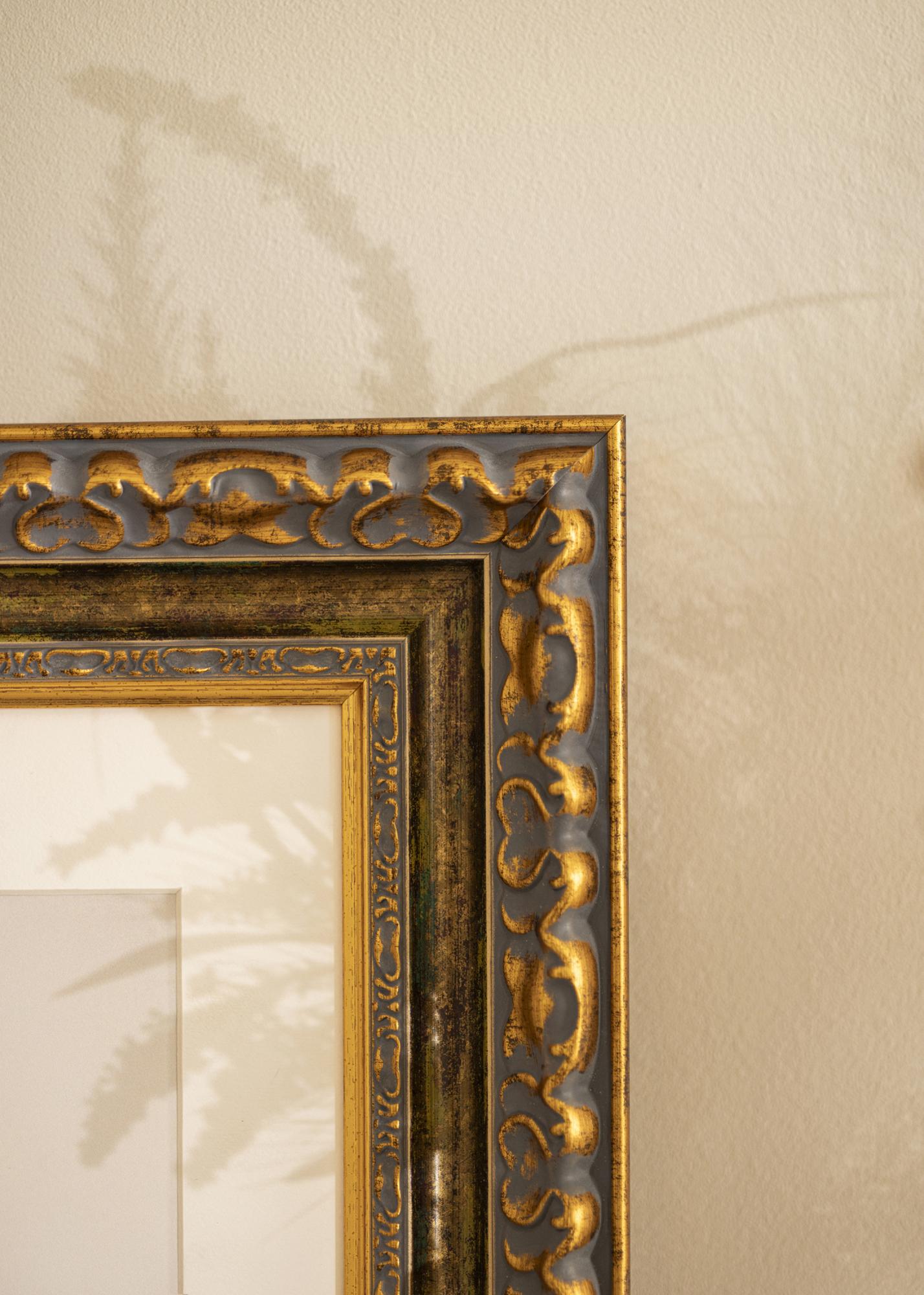 Czy chcesz skomponować piękny obraz z dawnym zdjęciem rodzinnym lub ładnym zdjęciem rodziny? W takim razie mamy tutaj luksusową ramkę, która dodaje charakteru i przyciąga uwagę! Ramka jest efektownie postarzona, z wzorami zmieniającymi się w złoto i szarość oraz złoto, zieleń i brąz. Ponieważ jest produkowana w naszej własnej pracowni ramiarskiej, możesz być pewien, że otrzymasz piękną ramkę wysokiej jakości.