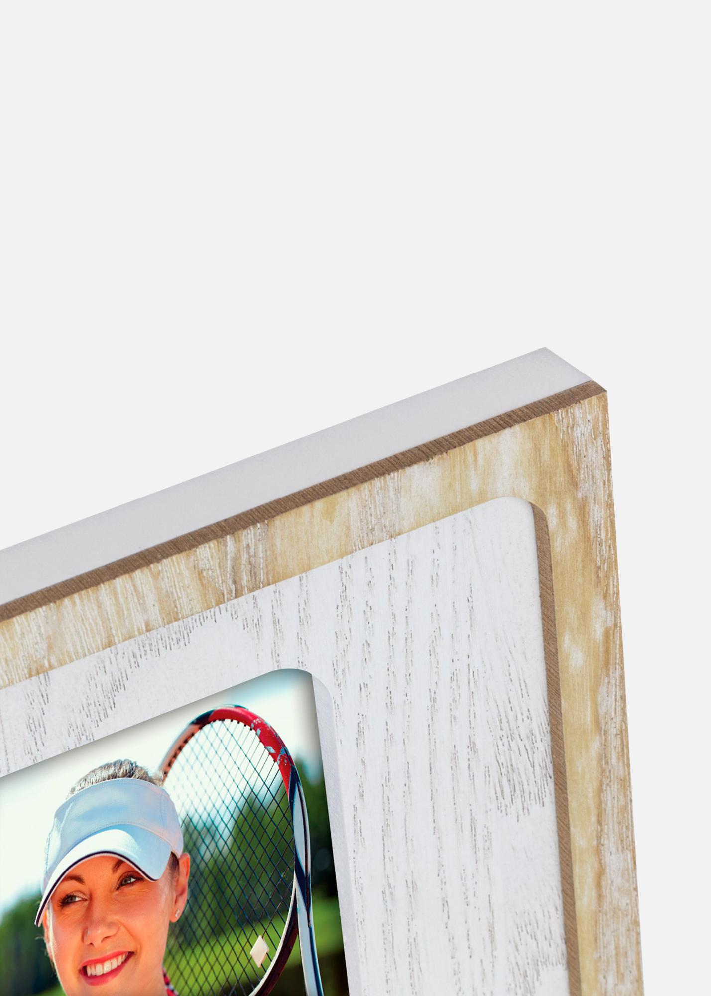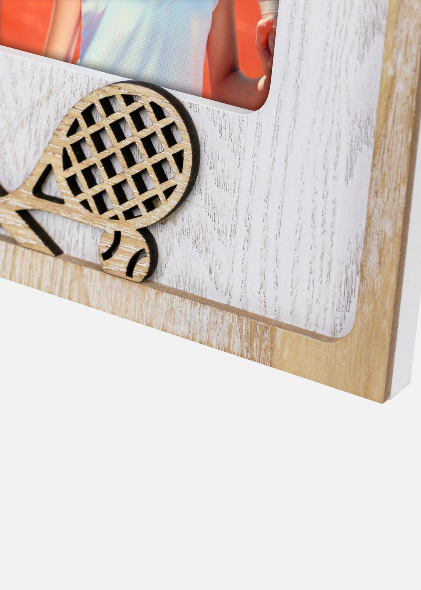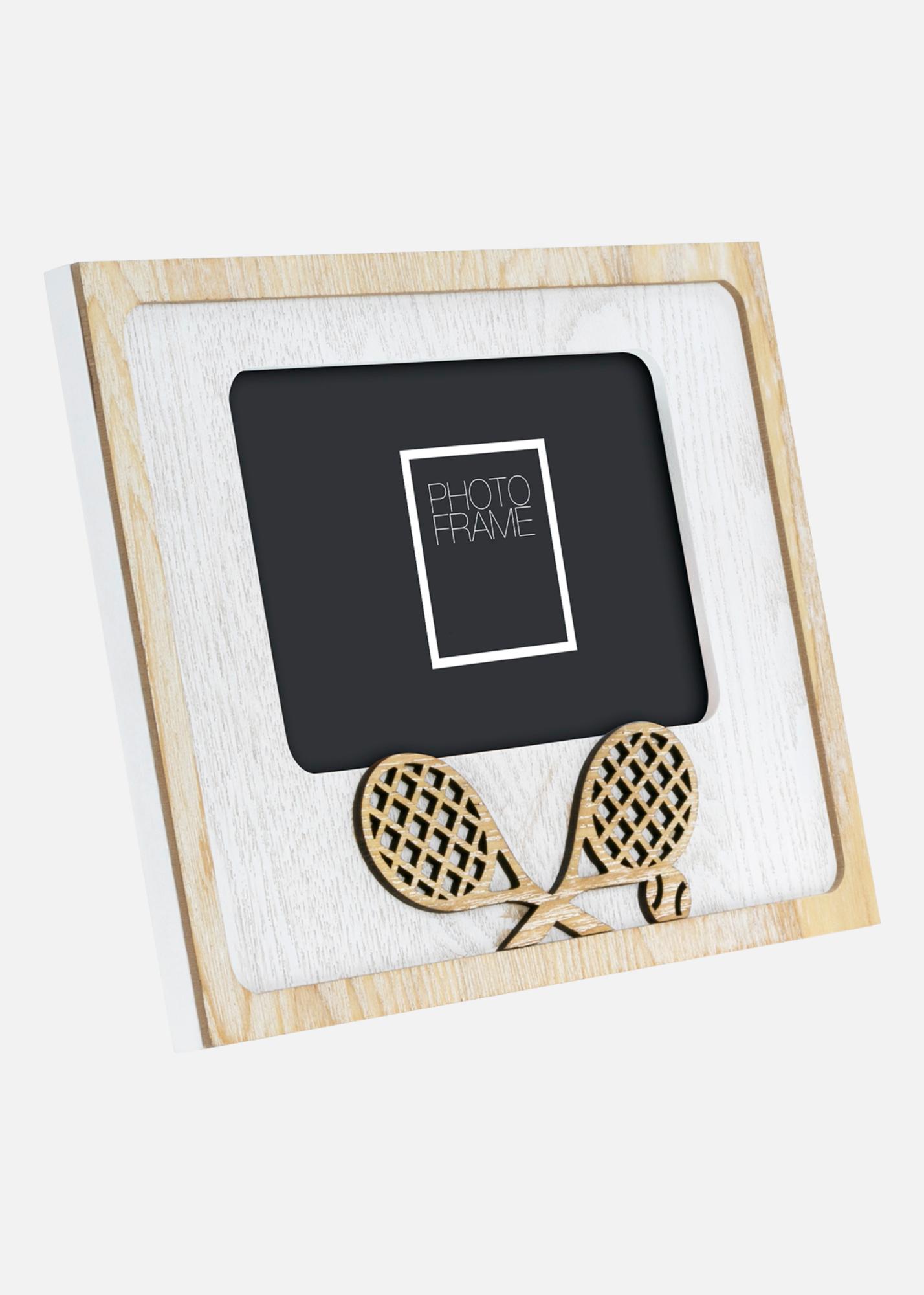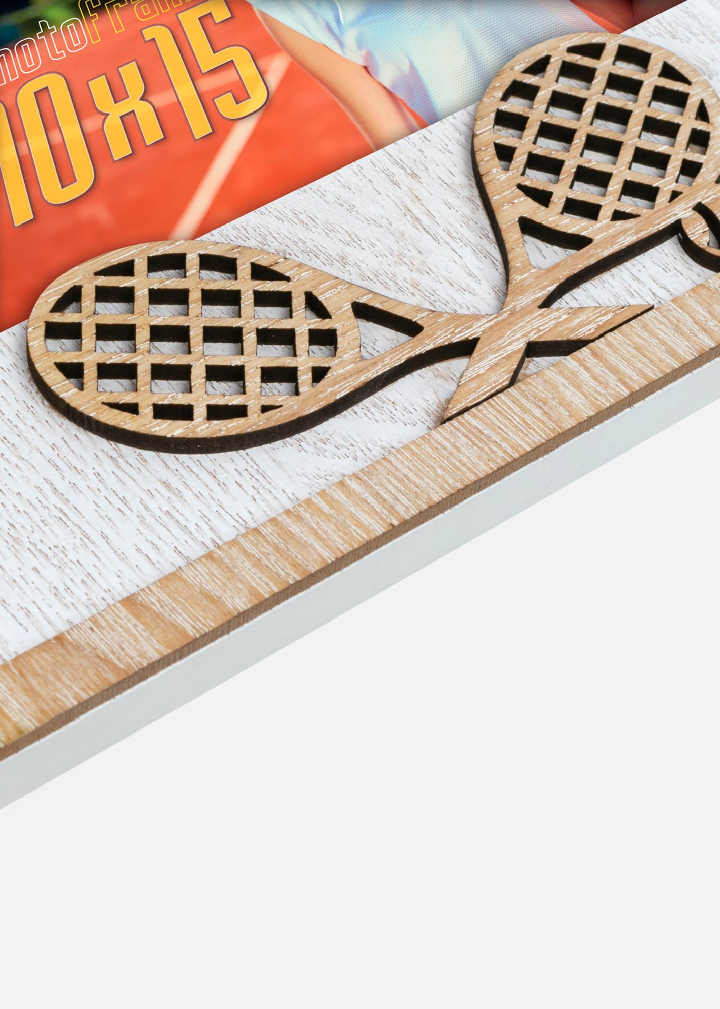 Sportowo inspirowana ramka na zdjęcia z motywem tenisowym. Ozdobiona wyciętymi rakietami tenisowymi, idealna do oprawienia wspomnień z kortów tenisowych lub aktywności sportowych. Pasuje do zdjęcia o wymiarach 10x15 cm.