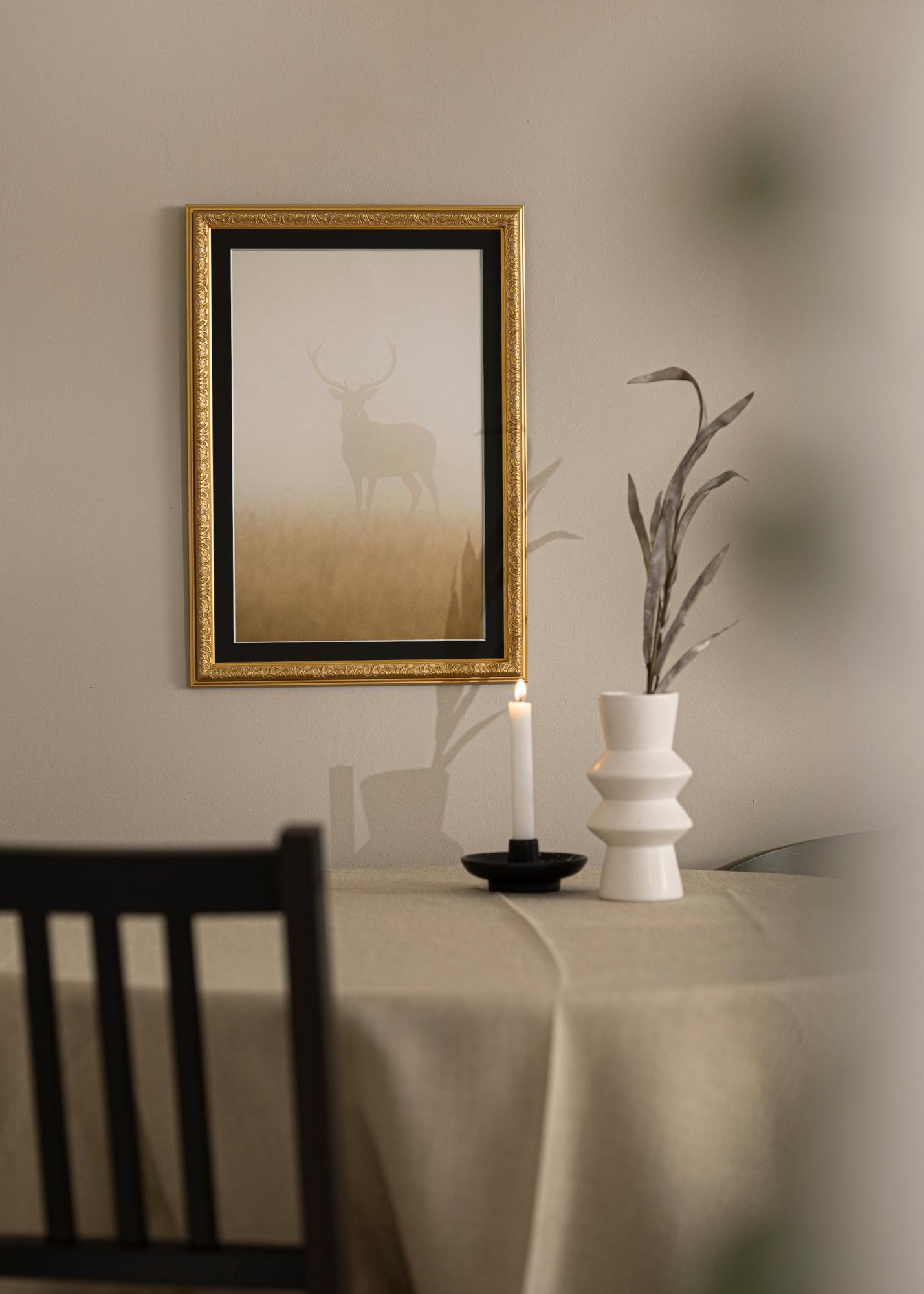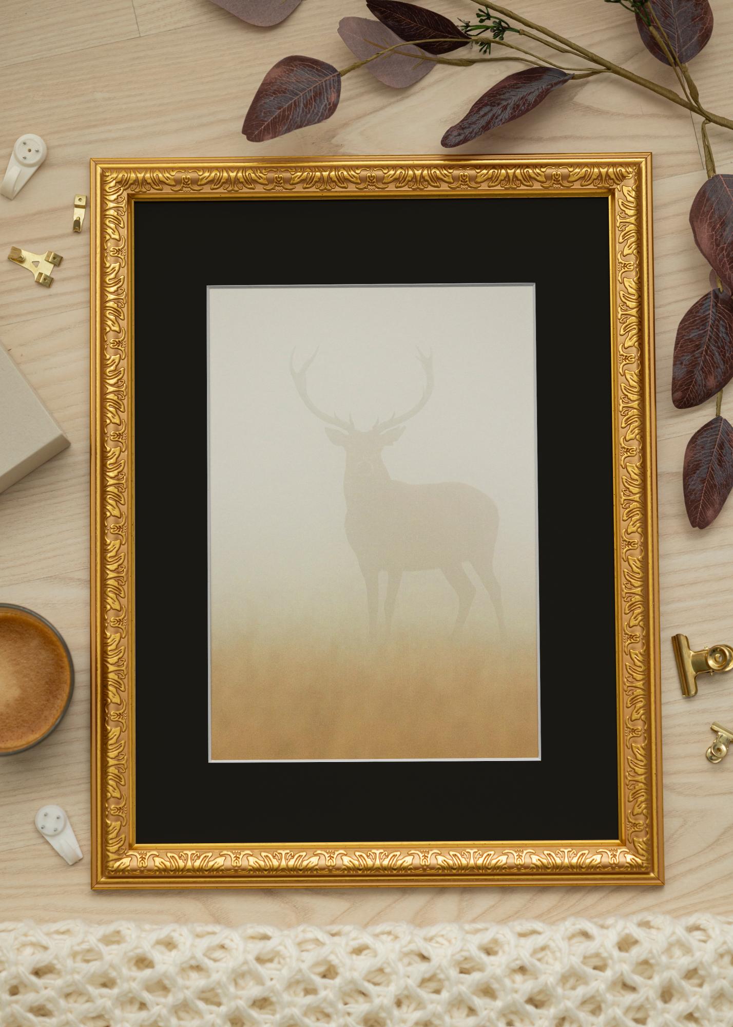 Daj swoim ulubionym zdjęciom uwagę, na jaką zasługują, dzięki eleganckiej ramie w złotym kolorze, uzupełnionej czarnym passepartout. To wyrafinowane połączenie podkreśla kontrast i głębię Twojej fotografii lub dzieła sztuki, a jednocześnie czarne passepartout tworzy wizualną przerwę, która przyciąga wzrok obserwatora do obrazu. Błyszczący złoty odcień ramy dodaje luksusowego akcentu do Twojego wnętrza i doskonale pasuje zarówno w klasycznych, jak i nowoczesnych aranżacjach.