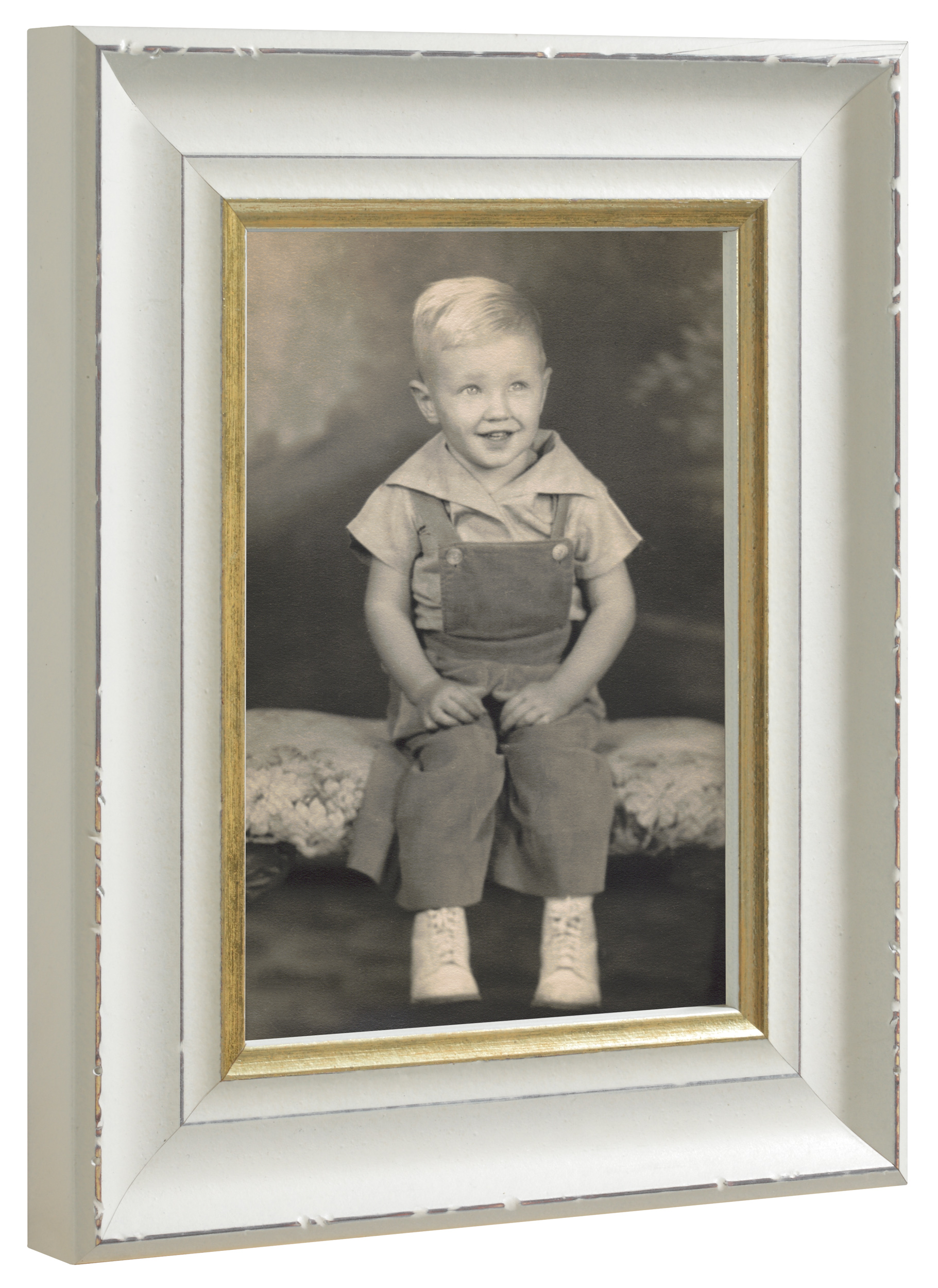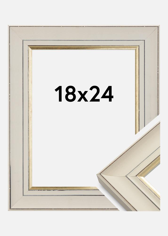 Ramka na zdjęcia w klasycznym stylu z ekscytującym retro wyczuciem. Ramka ma zniszczony profil w kolorze białym z eleganckim złotym brzegiem najbliżej obrazu, dzięki swojej neutralnej konstrukcji i doborowi kolorów jest to ramka, która pasuje do prawie wszystkich środowisk i do każdego rodzaju motywu.