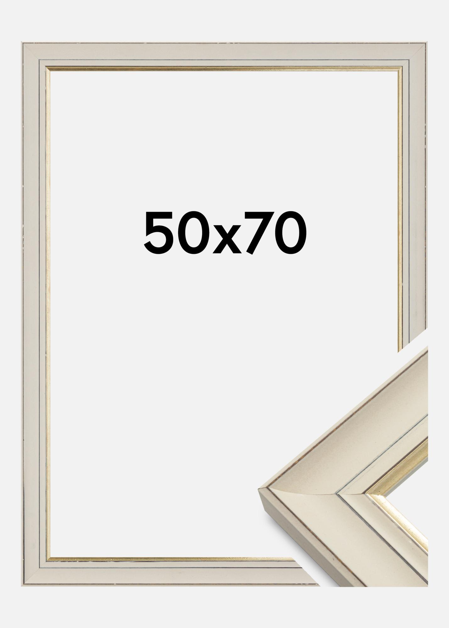 Ramka na zdjęcia w klasycznym stylu z ekscytującym retro wrażeniem. Ramka ma zużytą profilę w białym kolorze z elegancką złotą krawędzią najbliżej motywu, dzięki swojej neutralnej konstrukcji i wyborowi koloru jest to ramka, która pasuje do prawie wszystkich środowisk i do każdego rodzaju motywu.