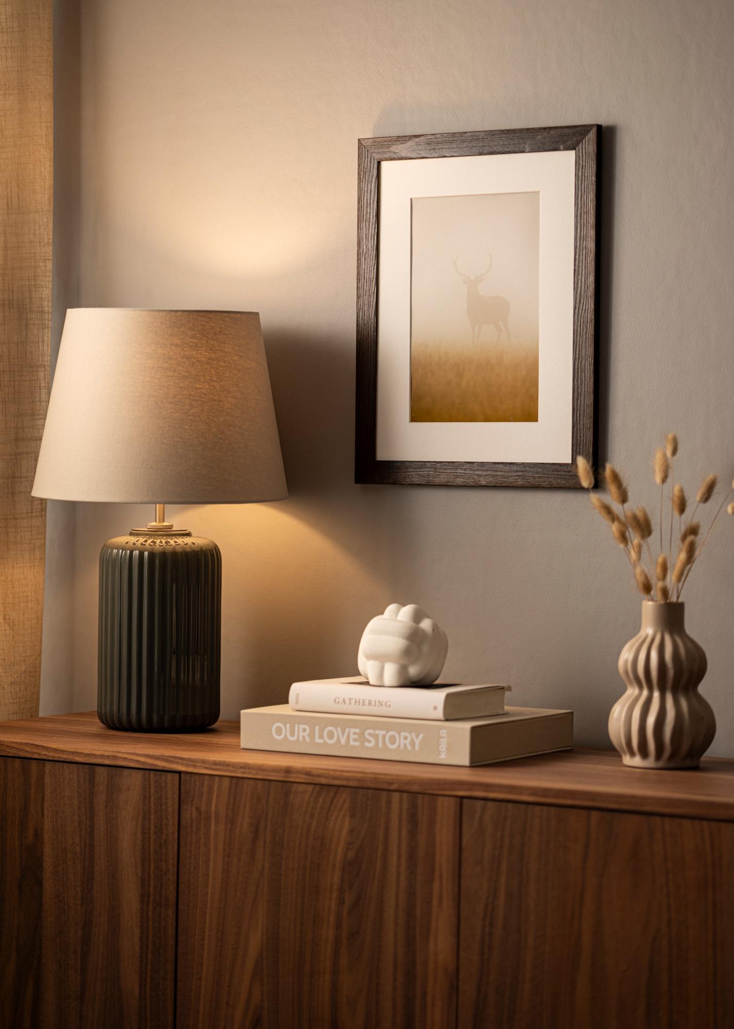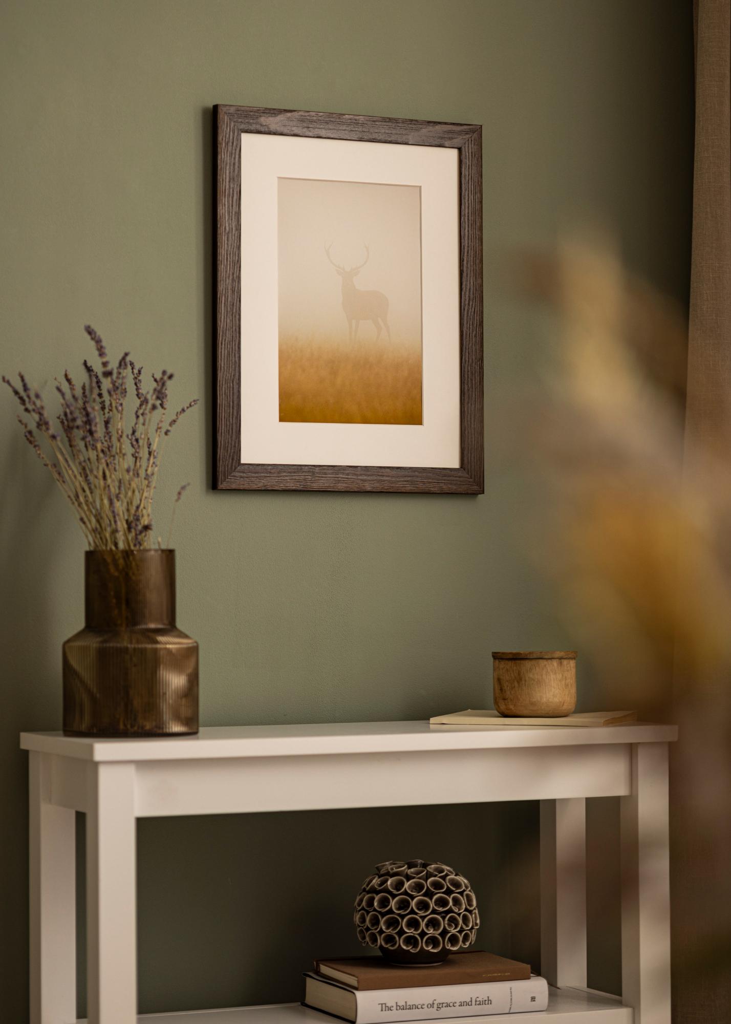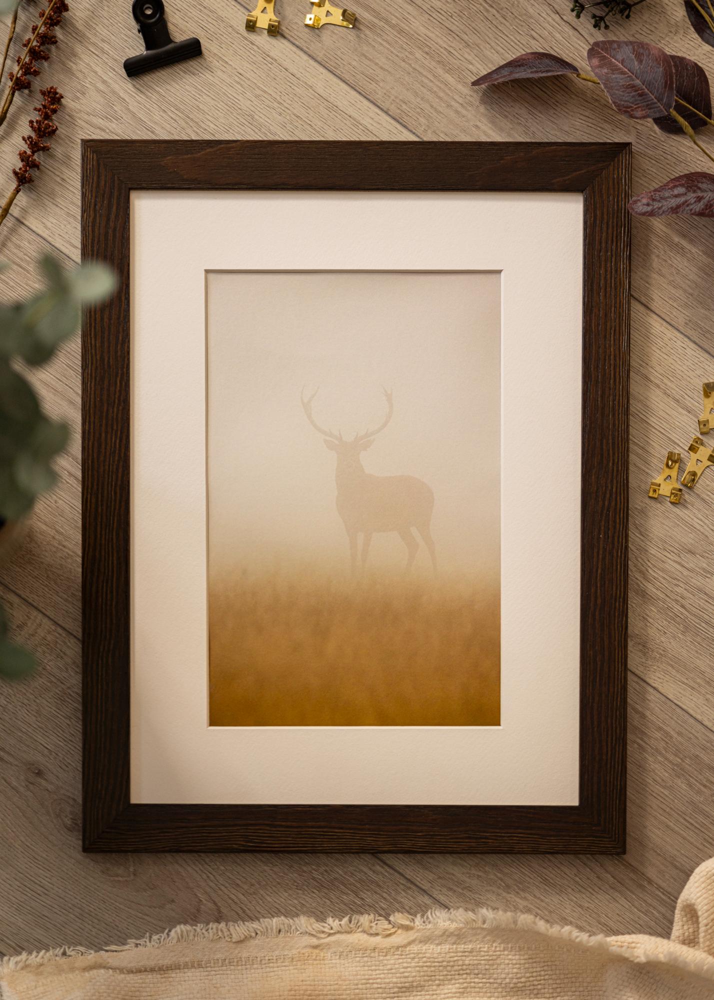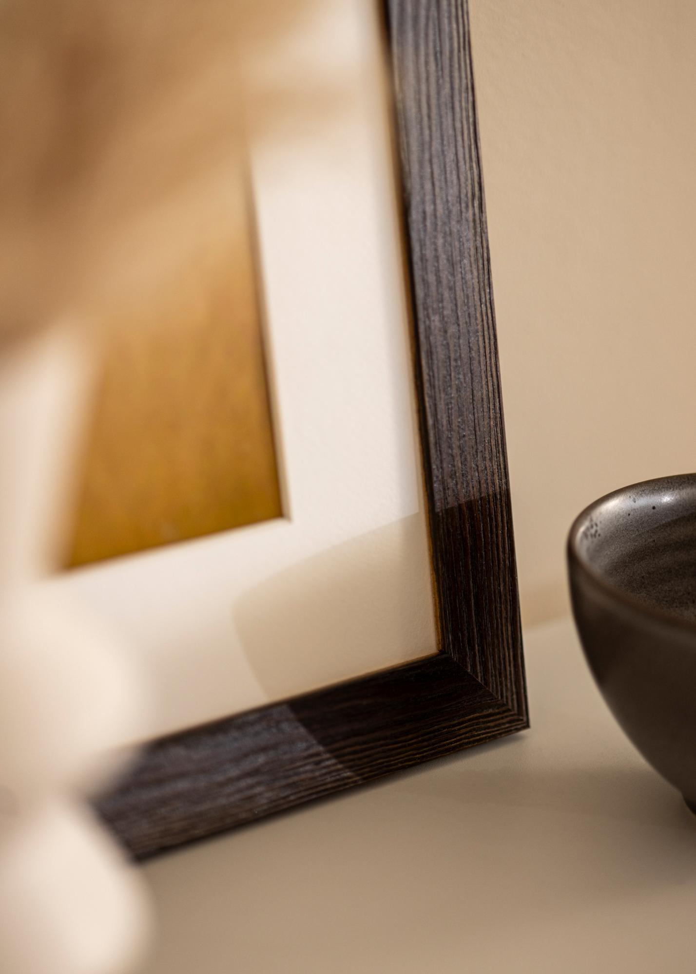 Solidna brązowa rama drewniana z widocznymi słojami drewna o szerokim profilu. Doskonała, gdy szukasz ciemnej drewnianej ramy z naturalnym wyglądem. Idealna do zdjęć przyrodniczych i krajobrazowych.