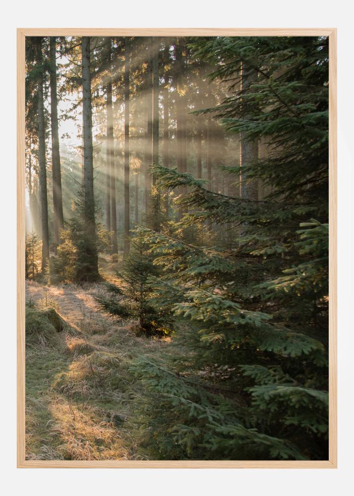 Uroczy portret lasu. Gdy słońce zachodzi za liśćmi, ziemia otoczona jest mniejszymi drzewami. Ten malowniczy krajobraz tworzy przyjemnie ciepłą atmosferę oraz relaksujące i odświeżające otoczenie. Idealny plakat do zielonego salonu.