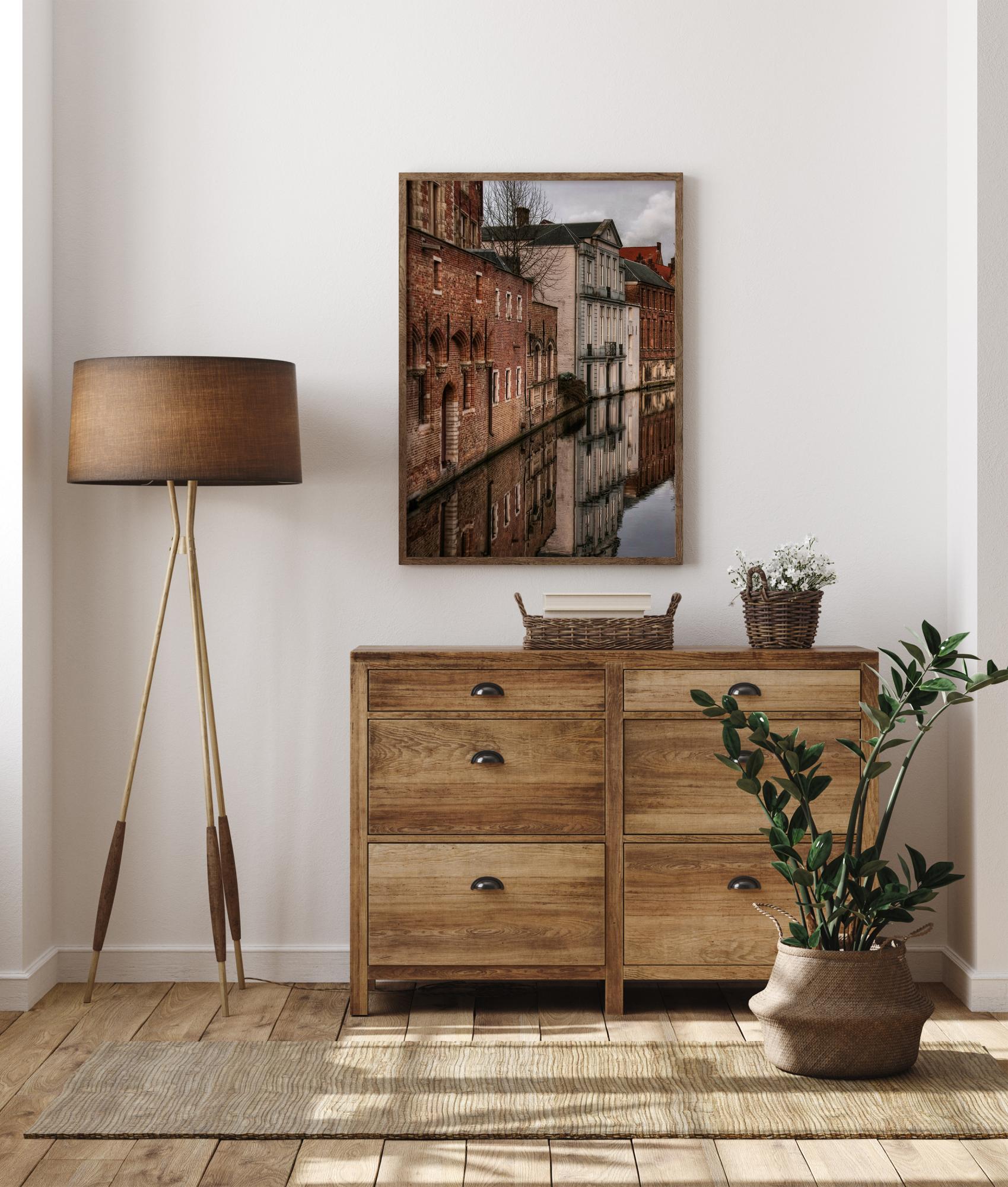 Nostalgiczny plakat z rzędami starych domów wzdłuż rzeki. Proste, rustykalne, czerwone domy z cegły i ich architektoniczne detale odbijają się w spokojnej wodzie poniżej. Wyobraź sobie, że płyniesz wzdłuż tych budynków, rozmyślając o przeszłości.