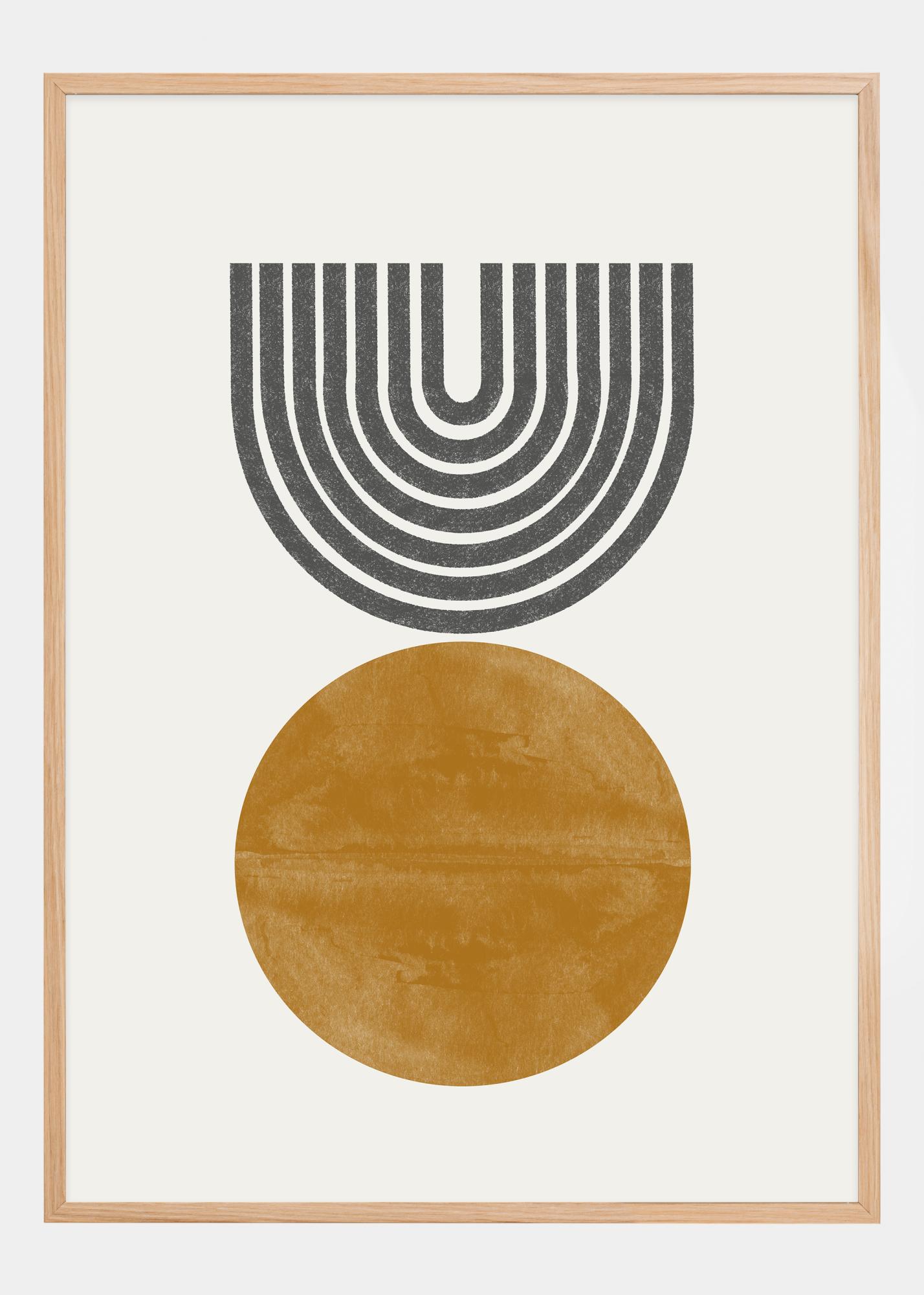 Ten retroinspirowany plakat łączy geometryczną precyzję z organicznymi krzywymi, tworząc poczucie ruchu i retroczaru. Duży okrowy okrągły obiekt na dole zapewnia mocną podstawę, podczas gdy czarno-białe łuki powyżej przypominają fale dźwiękowe lub abstrakcyjny krajobraz, co daje interesujący kontrast i głębię.