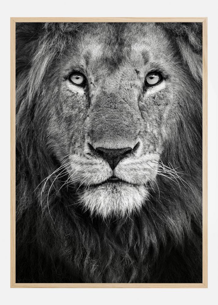 Ten potężny i wyrazisty plakat przedstawia zbliżenie portretowe lwa w czerni i bieli, ukazując majestatyczną obecność i dziką esencję zwierzęcia. Intensywne spojrzenie lwa, jego gęsta grzywa oraz każde pojedyncze wąsy ożywają dzięki wysokiemu kontrastowi i bogactwu detali na fotografii. To motyw, który natychmiast przyciąga wzrok i tworzy głębokie i trwałe wrażenie.