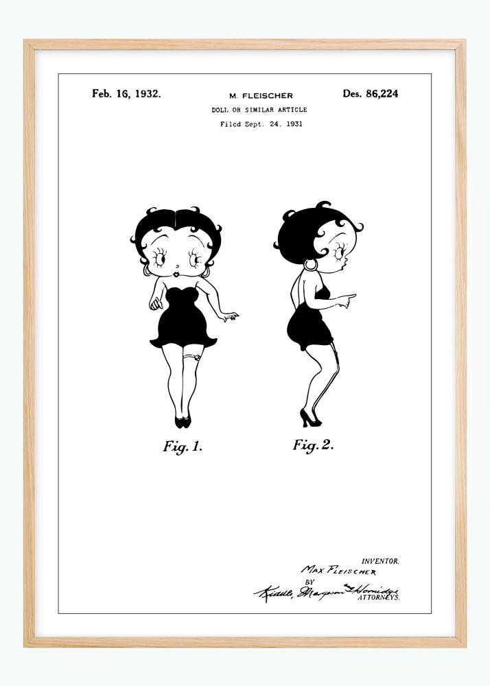 Ten zabawny i nostalgiczny plakat patentowy na Betty Boop, zaprojektowany przez M. Fleischera, według amerykańskiego urzędu patentowego z dnia 16 lutego 1932 pod numerem Des. 86,224. Z datą złożenia 24 września 1931, ilustracja ta odzwierciedla ukochaną erę projektowania zabawek. Plakat, który przedstawia lalkę w dwóch różnych pozach, jest nieodpartym artykułem dekoracyjnym dla kolekcjonerów lub uroczym dodatkiem do pokoju dziecka.