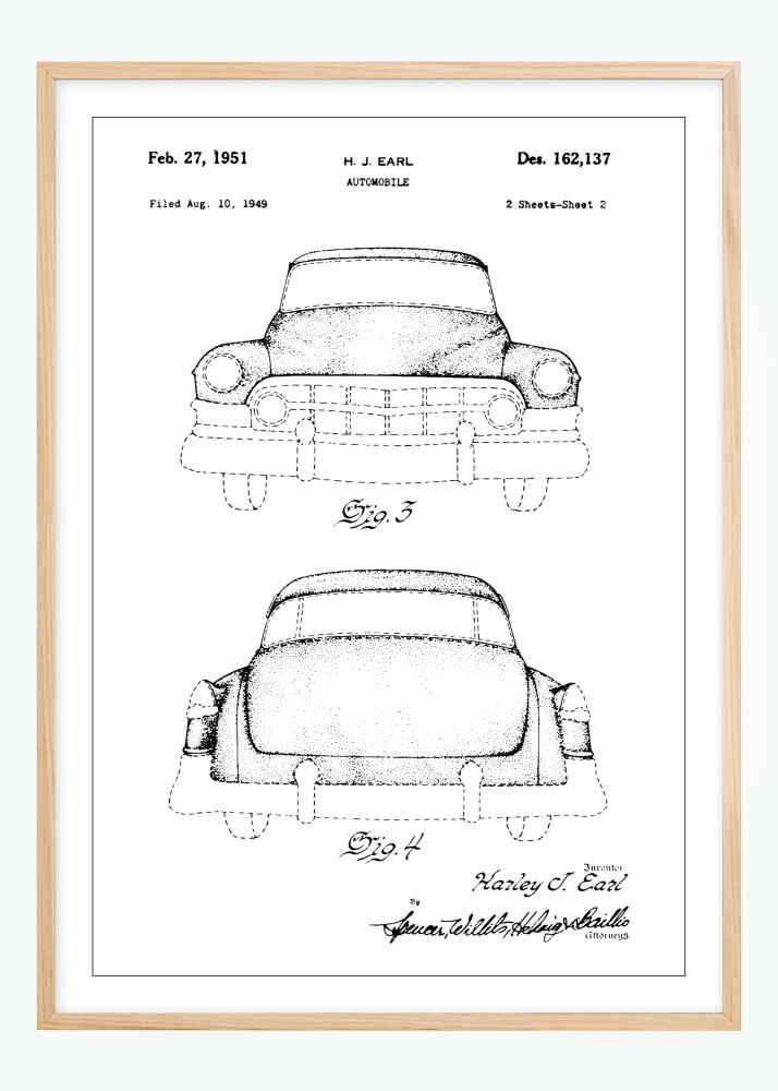 Ten stylowy plakat patentowy przedstawia kultowego Cadillaca, będącego hołdem dla postępów technicznych w motoryzacji XX wieku. Zaprojektowany przez H.J. Earla i opatentowany 27 lutego 1951 roku pod numerem Des. 162,137, ten rysunek patentowy jest obowiązkowym dla wszystkich, którzy cenią estetykę klasycznych samochodów i historię designu. Plakat pokazuje pojazd w profilu z przodu i z tyłu, a bogactwo szczegółów w ilustracjach wywołuje poczucie nostalgii i podziwu.
