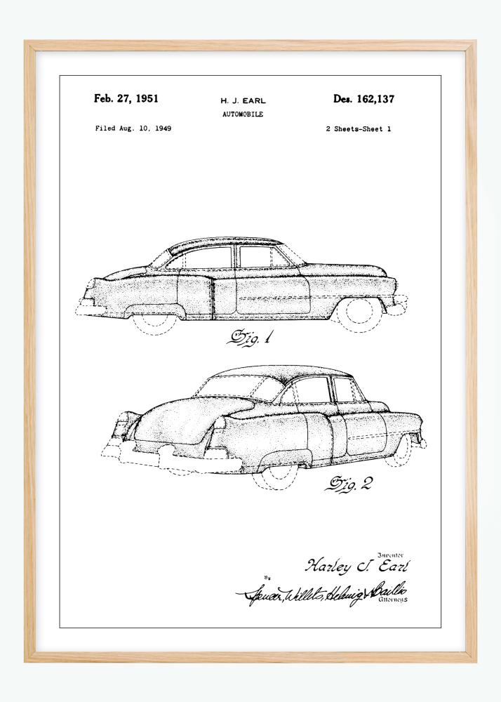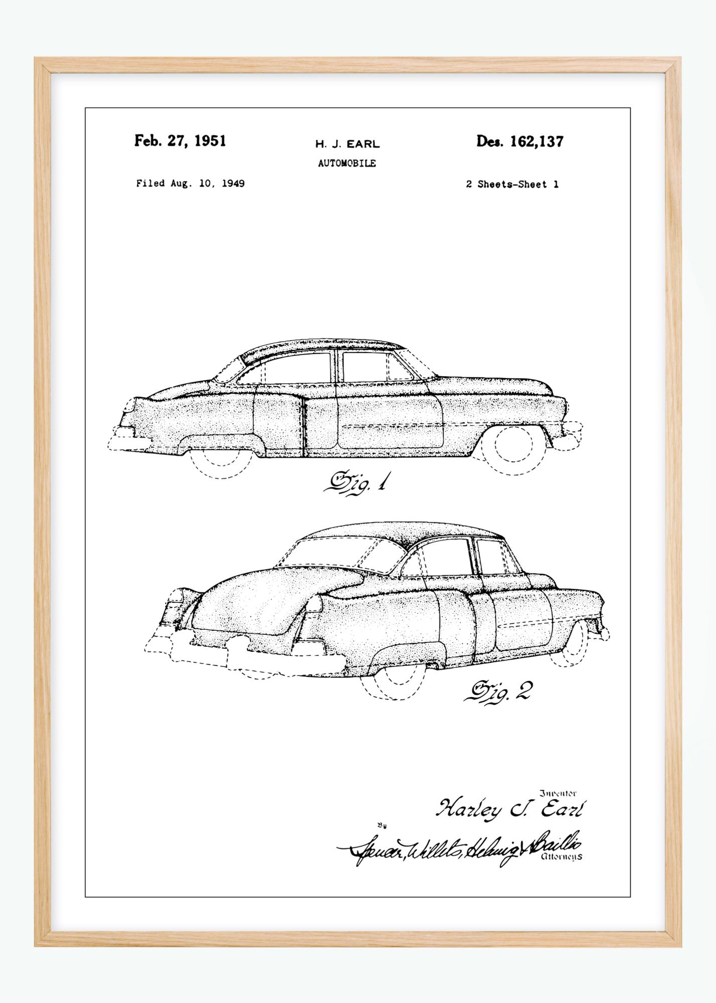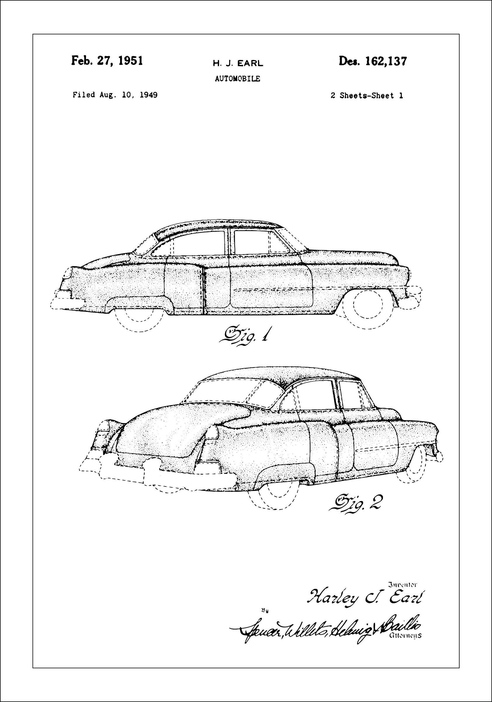 Ten plakat patentowy przedstawia wyrafinowany rysunek samochodu marki Cadillac, zaprojektowany przez słynnego H.J. Earla. Datowany na 27 lutego 1951 roku, z numerem patentowym Des. 162,137, pierwotnie złożonym 10 sierpnia 1949 roku, obraz ten uchwyca istotę powojennego przemysłu samochodowego. Motyw ten jest hołdem dla złotej ery amerykańskiego samochodu i został wykonany z dbałością o szczegóły, które przemawiają zarówno do producentów samochodów, jak i miłośników designu.