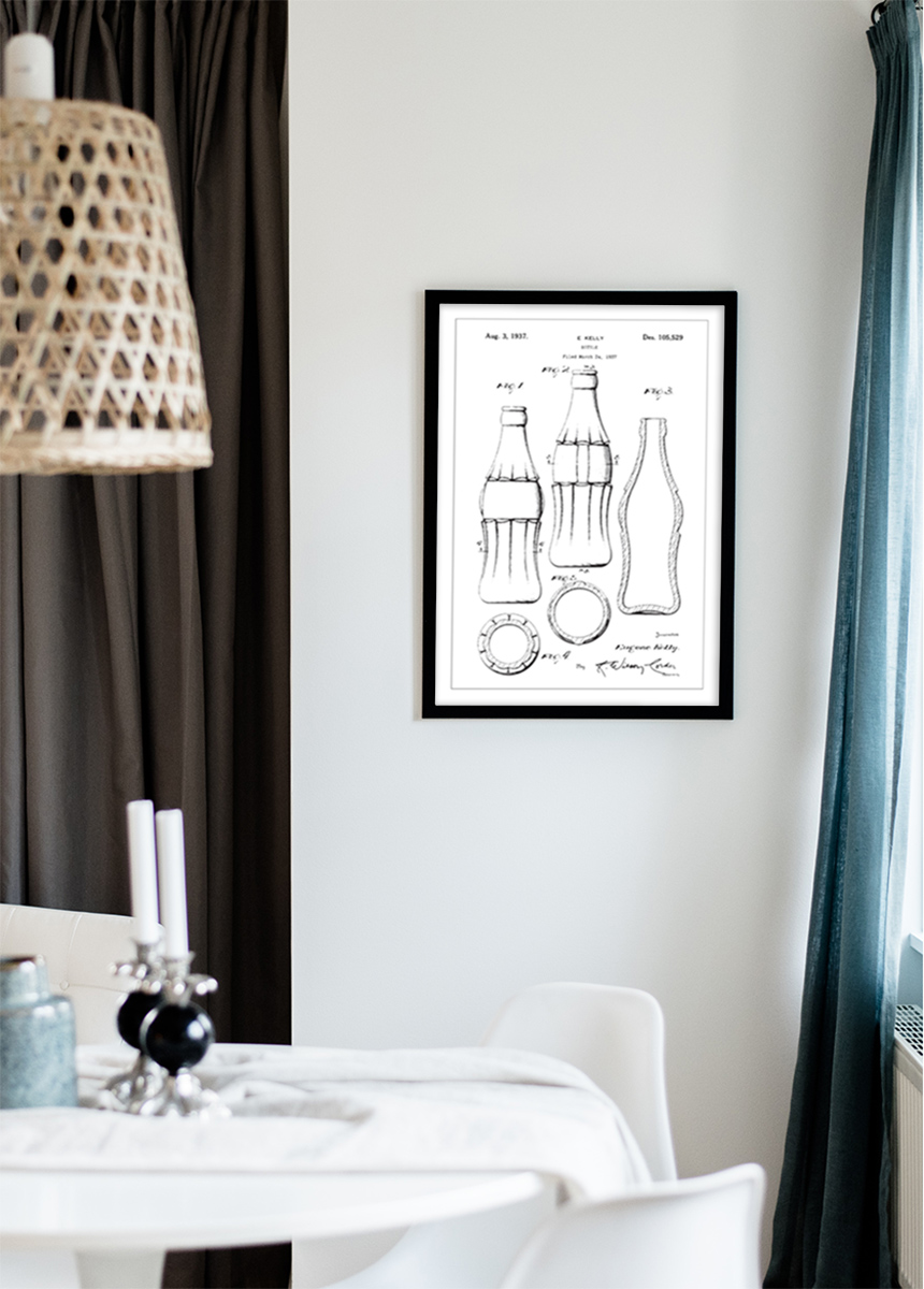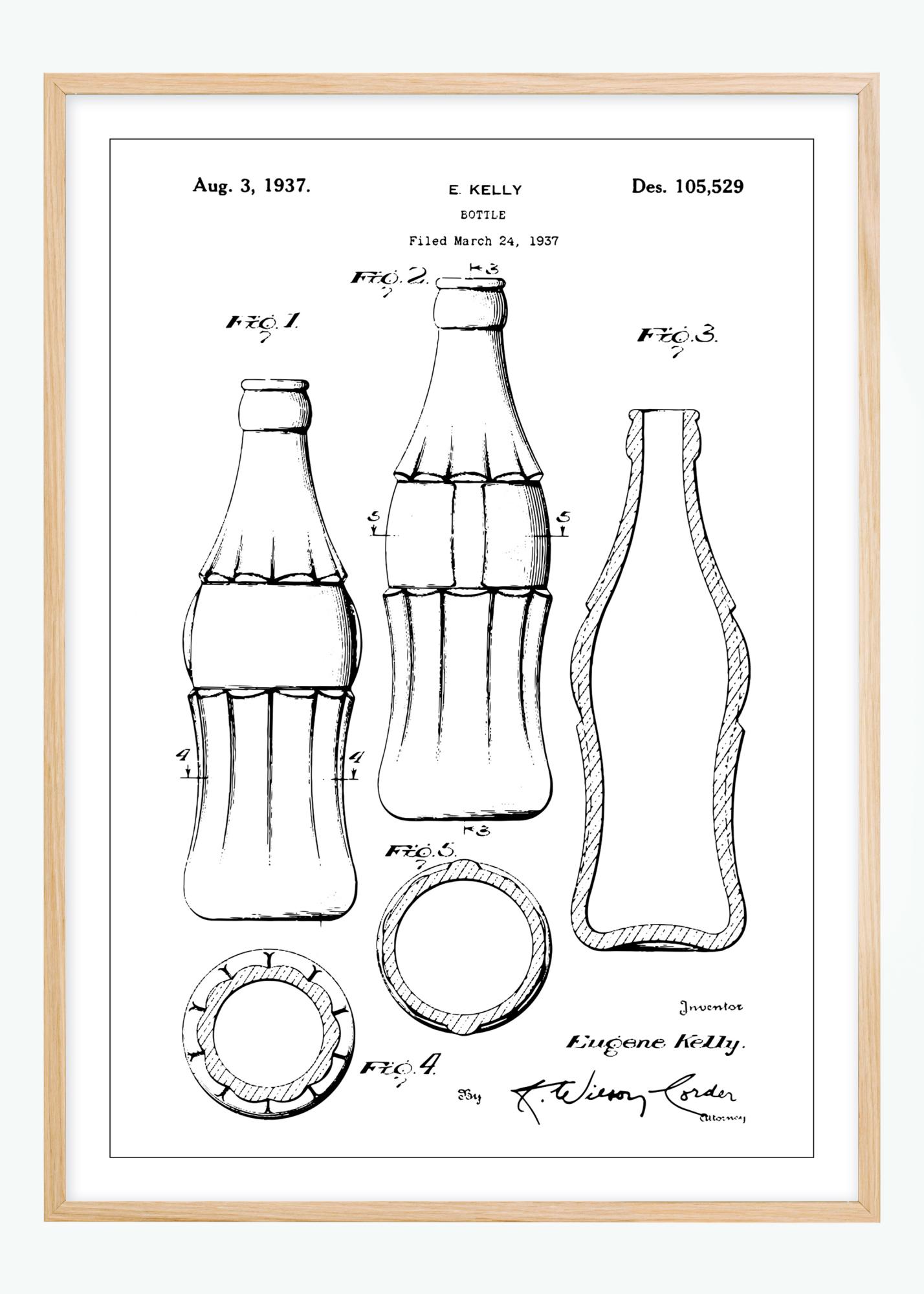 Ten patentowy plakat przedstawia projekt butelki CocaCola, który został przyznany E. Kelly'emu 3 sierpnia 1937 roku pod numerem patentu Des. 105,529. Ilustracja ukazuje szczegółowe kontury i proporcje butelki z kilku kątów, dając pełen obraz projektu. Ikoniczny kształt butelki stał się synonimem produktu, który zawiera, i jest ponadczasową reprezentacją brandingowej i produktowej wizji.