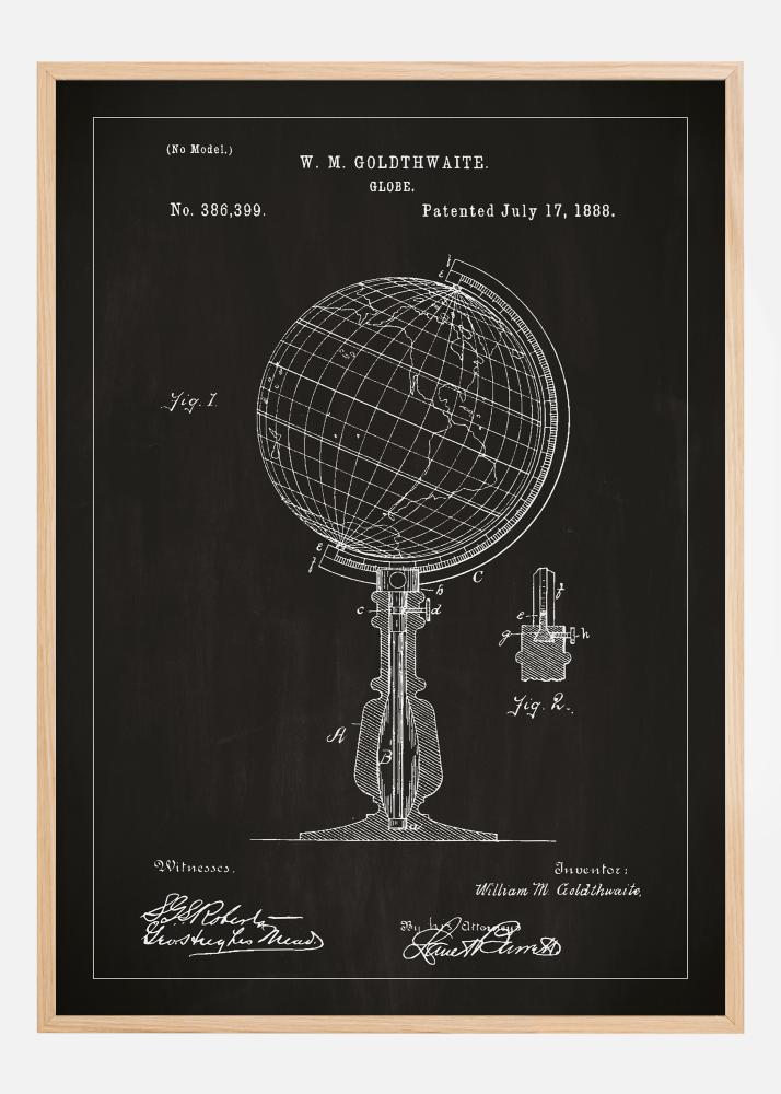 Ten plakat patentowy przedstawia projekt klasycznego globusa W. M. Goldthwaite'a, szczegółowe dzieło uwiecznione pod numerem patentu 386,399 z dnia 17 lipca 1888 roku. Plakat uchwyca elegancję i funkcjonalne piękno wynalazku, ilustrując świat w dwóch wymiarach w sposób inspirujący do odkrywania i eksploracji. Precyzyjne linie i klarowność projektu czynią go doskonałym narzędziem edukacyjnym i pożądanym elementem dekoracyjnym dla tych, którzy cenią geografię i historię świata.
