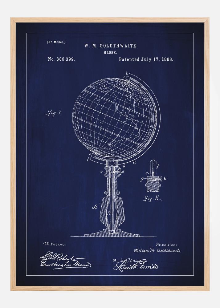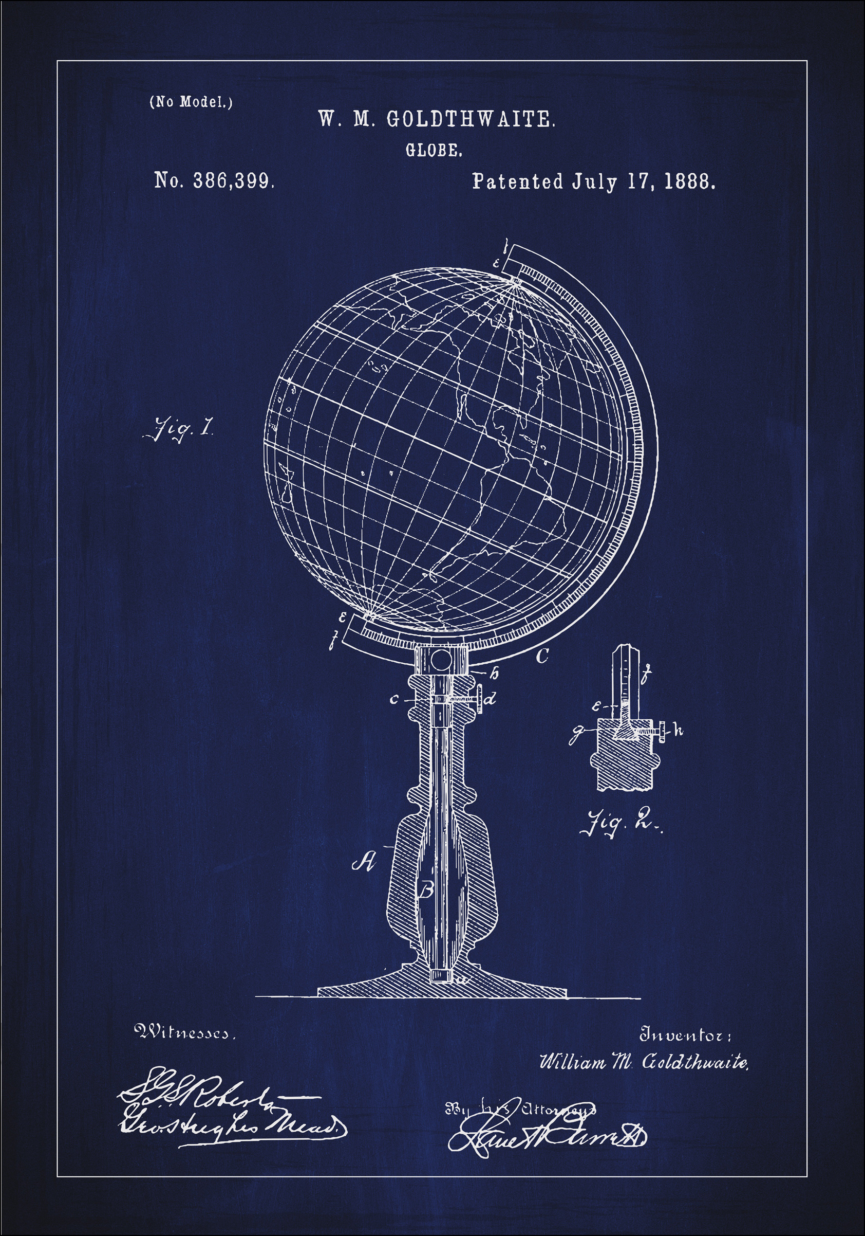Stwórz zapraszającą i intelektualnie stymulującą przestrzeń dzięki naszemu plakatowi patentowemu przedstawiającemu klasycznie zaprojektowany globus W. M. Goldthwaite'a, chronionego patentem numer 386,399 od 17 lipca 1888 roku. Ten szczegółowy rysunek patentowy uchwyca nie tylko techniczną precyzję projektu, ale także czas, kiedy globalne odkrycia i zrozumienie stały się dostępne dla szerszej publiczności. Taka artystyczna prezentacja świata oferuje edukacyjną perspektywę, jednocześnie będąc elegancką dekoracją.