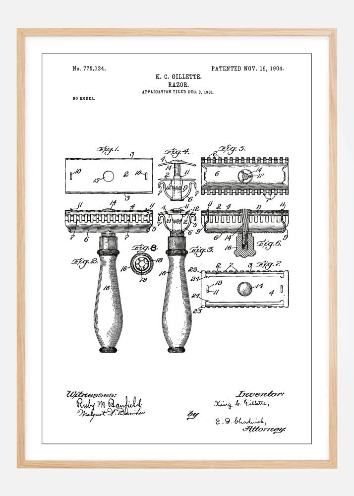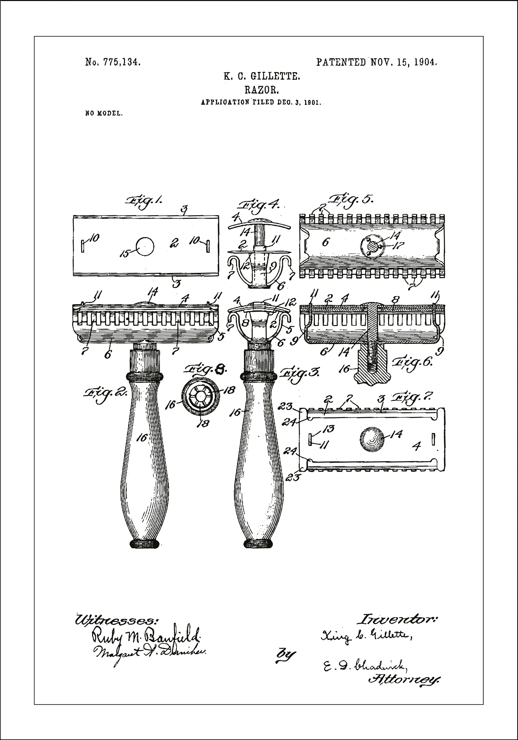 Z ikonicznym i eleganckim designem, ten plakat patentowy prezentuje rewolucyjne dzieło K.G. Gillette: maszynkę do golenia, opatentowaną 15 listopada 1904 roku, numer patentu 775134. Szczegóły tego rysunku patentowego podkreślają mechaniczne aspekty i nowatorską konstrukcję, która zmieniła osobistą higienę na zawsze, a to zostało udokumentowane po raz pierwszy w grudniu 1901 roku.