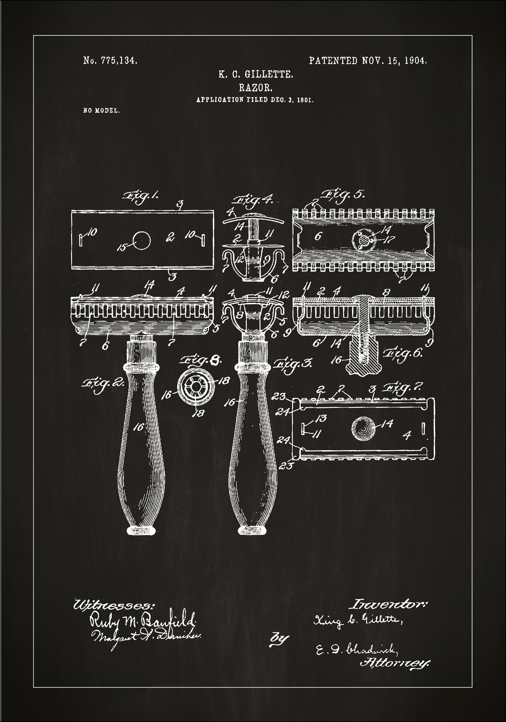 Ten plakat patentowy oferuje ekskluzywny wgląd w projekt jednego z najbardziej podstawowych narzędzi do pielęgnacji osobistej, mianowicie golarki. Patent, przyznany K.G. Gillette 15 listopada 1904 roku pod numerem 775,134, ilustruje rewolucyjną zmianę w sposobie, w jaki ludzie wykonywali codzienny rytuał golenia. Jest to szczegółowy rysunek patentowy, pokazujący różne perspektywy i elementy, które były nowatorskie w tamtym czasie.