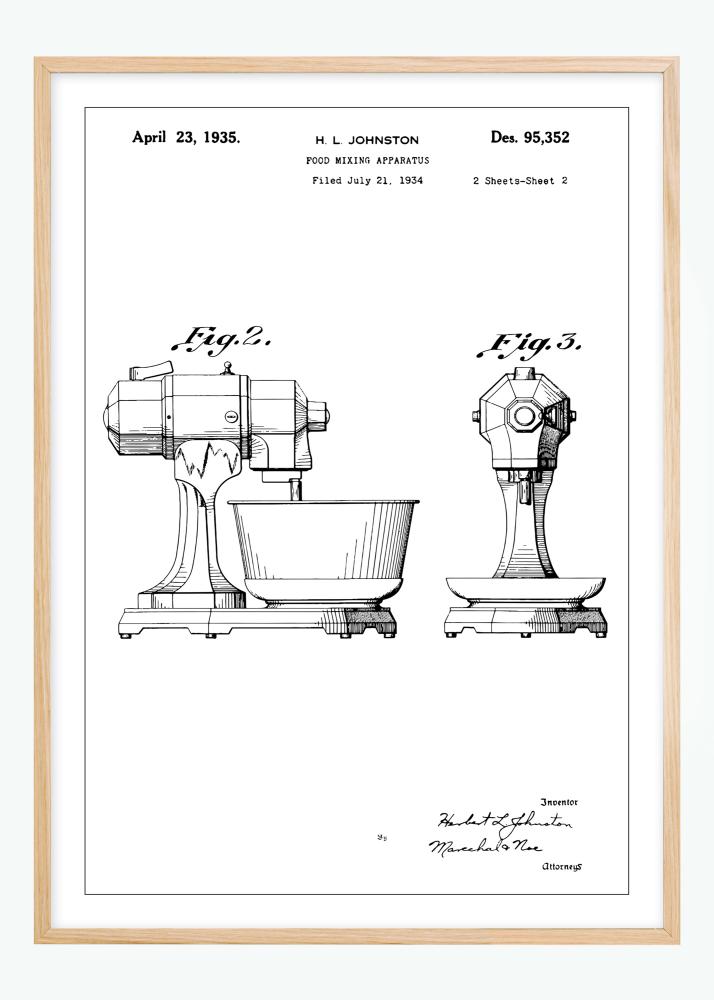Ten starannie szczegółowy plakat patentowy przedstawia urządzenie do mieszania żywności, niezbędne narzędzie w kuchni, które zrewolucjonizowało sztukę kulinarną. Patent, zaprojektowany przez H.L. Johnstona 23 kwietnia 1935 roku, pod numerem Des. 95,352, ilustruje wczesny projekt miksera stojącego, urządzenia domowego, które stało się niezbędne we współczesnej kuchni. Rysunek pokazuje urządzenie w dwóch widokach, co daje kompleksowe zrozumienie jego konstrukcji i funkcji.
