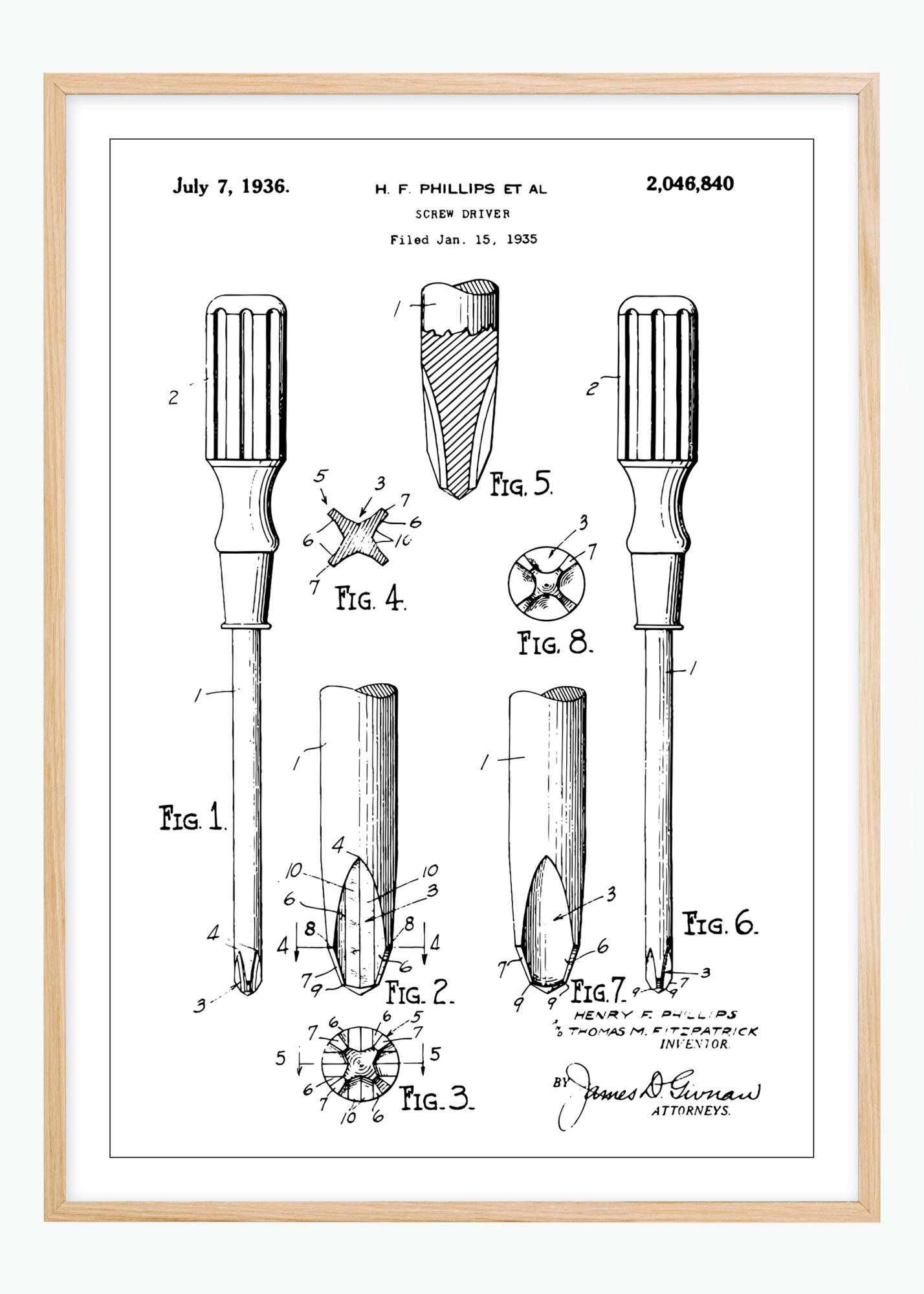 Przedstawiony tutaj jest klasyczny plakat patentowy, który przedstawia projekt śrubokręta, niezbędny klasyk w skrzynce narzędziowej każdego rzemieślnika. Datowany na 7 lipca 1936 i złożony 15 stycznia 1935, ten plakat patentowy pokazuje z dokładnością szczegóły konstrukcji i innowacje stojące za tym narzędziem, od jego kultowego uchwytu po unikalny kształt końcówki. Wynalazcy H.F. Phillips i inni stworzyli tym patentem, numer 2,046,840, standard w przemyśle narzędziowym, na którym wciąż polegamy do dziś.