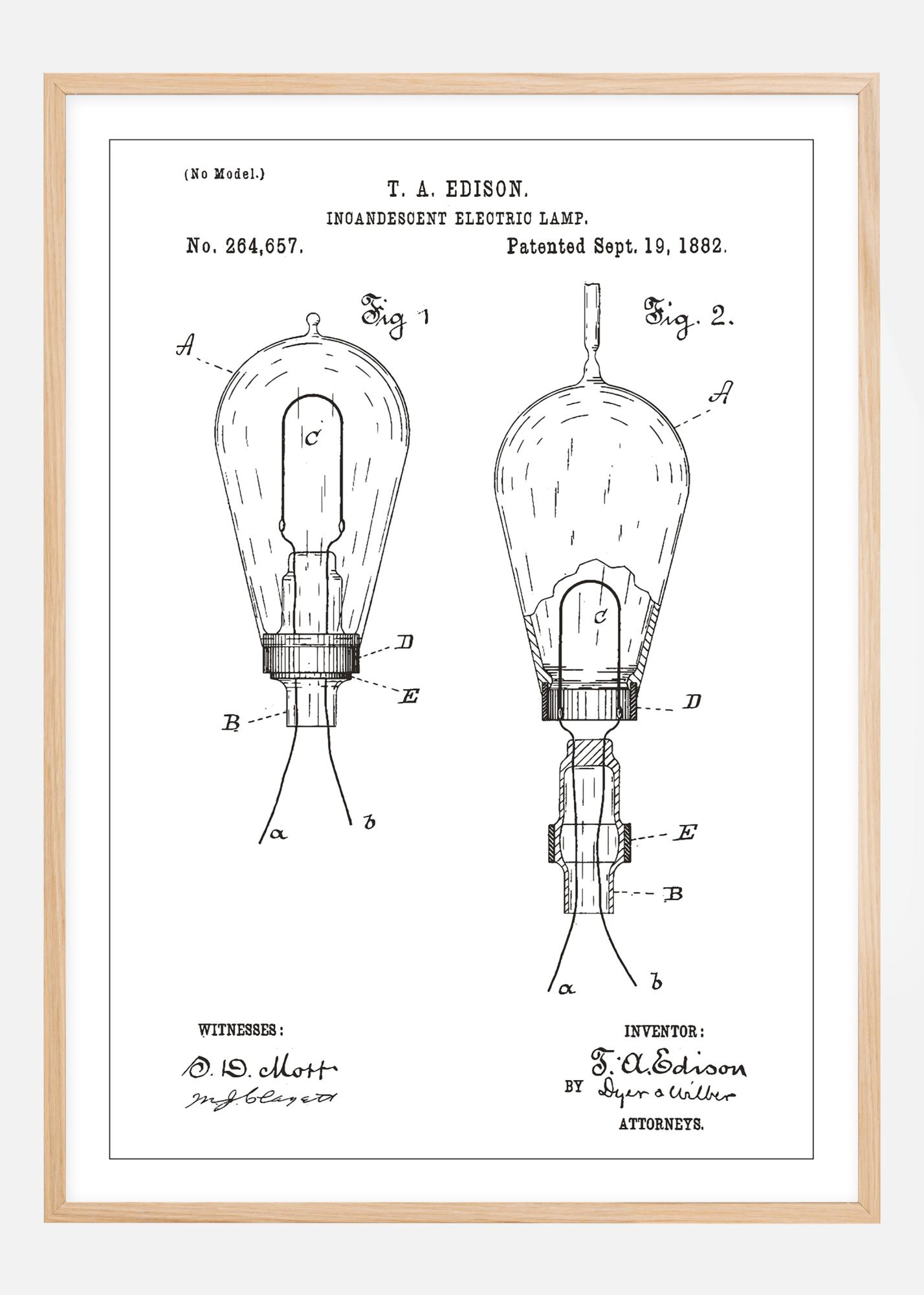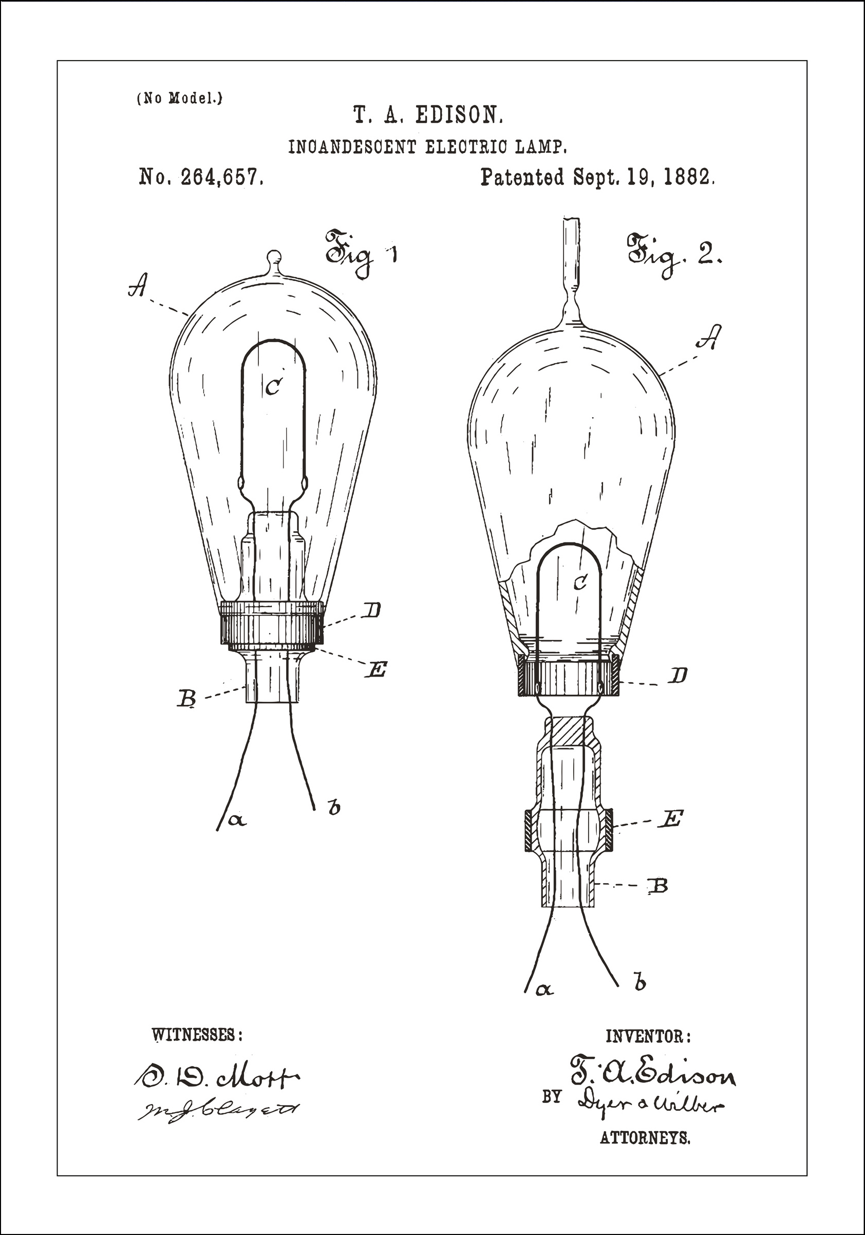 Ten specjalnie przygotowany plakat patentowy ujawnia piękno projektu T. A. Edisona żarówki, który ukształtował współczesny świat dzięki numerowi patentowemu 264,657, przyznanemu 19 września 1882 roku. Szczegółowa ilustracja podkreśla techniczne aspekty wczesnej wersji żarówki, która była jednym z pierwszych komercyjnie udanych modeli. Ten plakat patentowy jest doskonałym hołdem dla jednego z najbardziej wpływowych wynalazców wszechczasów i jego wkładu w elektryczne oświetlenie.