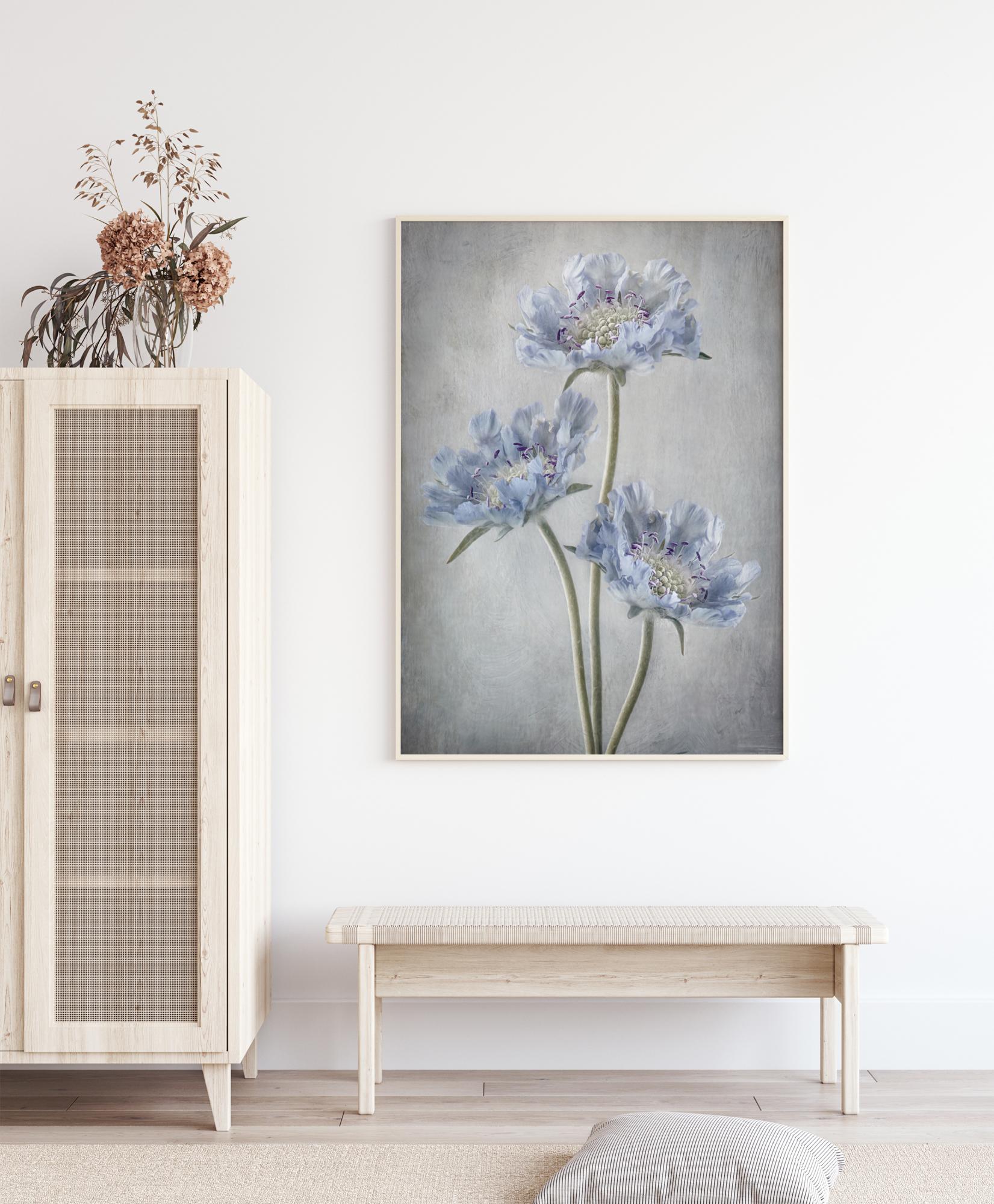 Eteryczny plakat z trzema Scabiosa na miękkiej jasnoniebieskiej ścianie. Zachwycające niebieskie płatki zwijają się ku górze w tym fantastycznym obrazie. Kwiaty są oświetlone przez bledszą białą tło, aby je wyróżnić. Obudź się do tego spokojnego martwego natury w swojej sypialni.