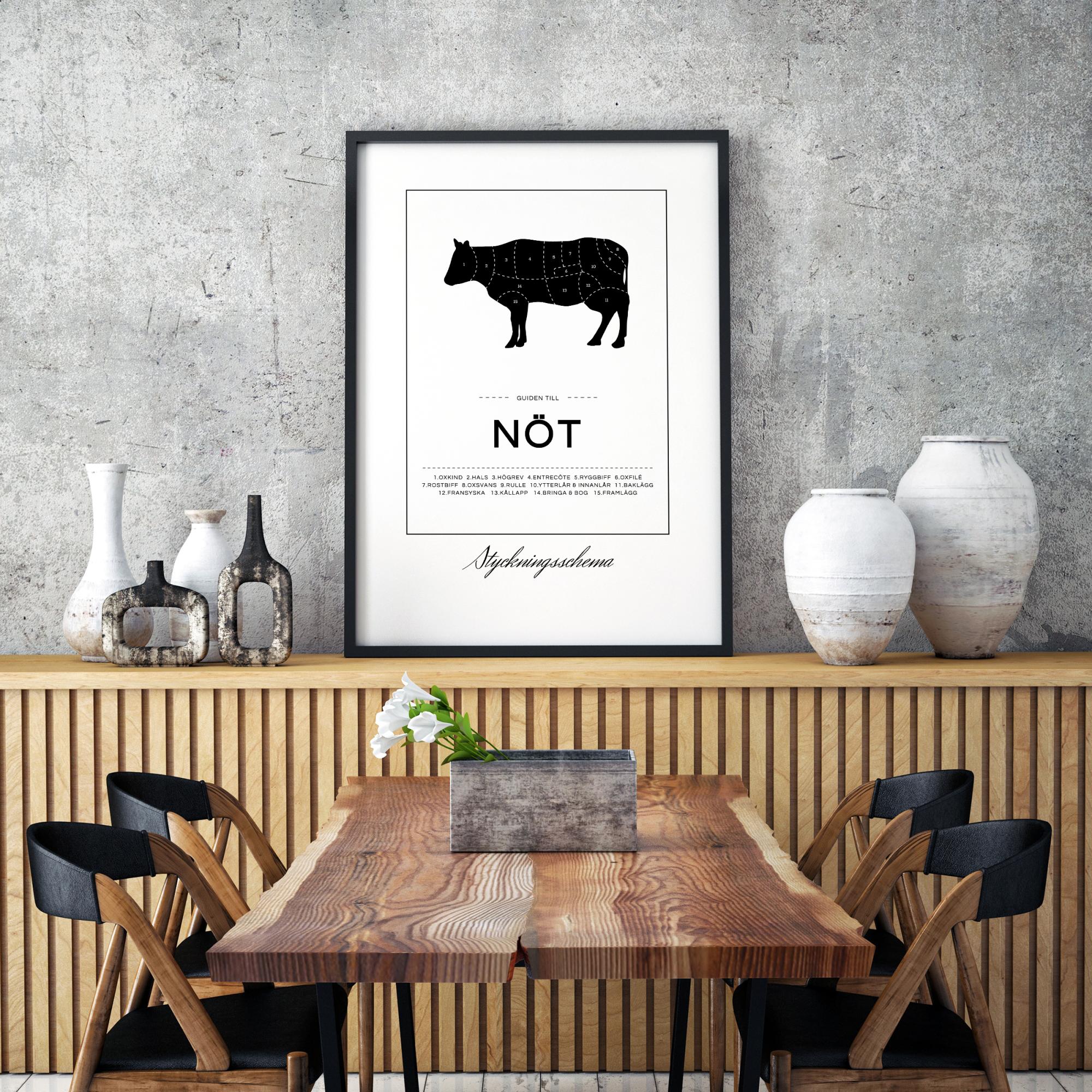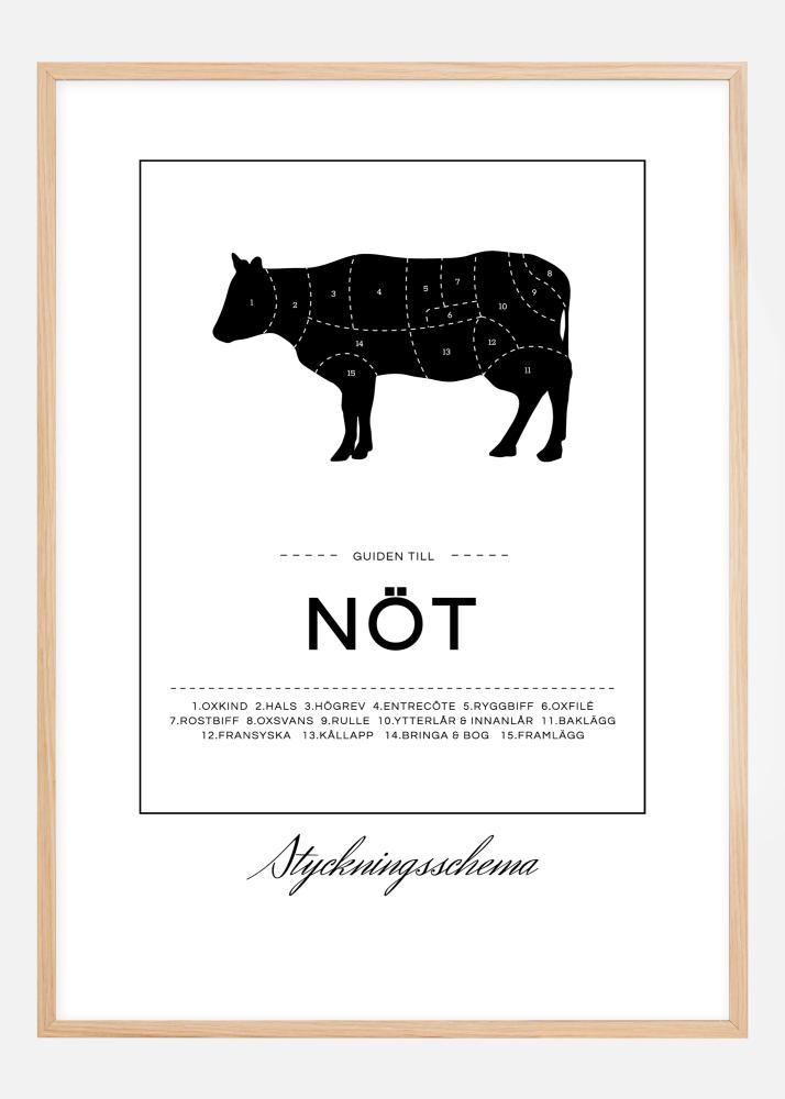 Plan cięcia to nie tylko dla profesjonalnych rzeźników! Ten stylowy plakat przedstawia czarną krowę podzieloną na oznaczenia pokazujące, skąd na przykład pochodzą rostbef, rolada i karkówka. Pod obrazkiem znajduje się tekst "Przewodnik po wołowinie" wraz z elegancką listą numerowaną z różnymi częściami. Wokół motywu biegnie cienki prostokąt, a pod prostokątem nadrukowany jest tekst "Plan cięcia". Czarny i biały design doskonale prezentuje się w połączeniu z ramką srebrną lub ramką w ulubionym kolorze. Plakat jest dostępny w kilku różnych formatach, więc łatwo znajdziesz taki, który pasuje do twojej kuchni.