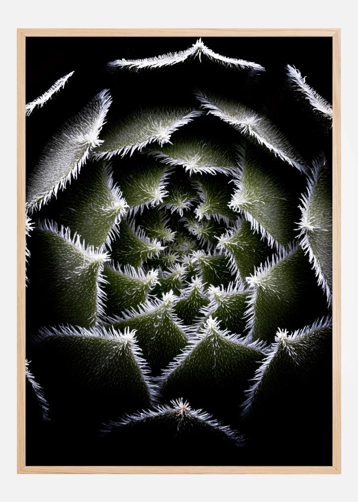 Makrofotografia rozety rośliny sempervivum. Zbliżenie tej rośliny ukazuje rozetę głęboko zielonych liści, z których każdy jest ozdobiony małymi białymi kolcami. Detale są niesamowite i każdy zatrzyma się przed tym zachwycającym plakatem.